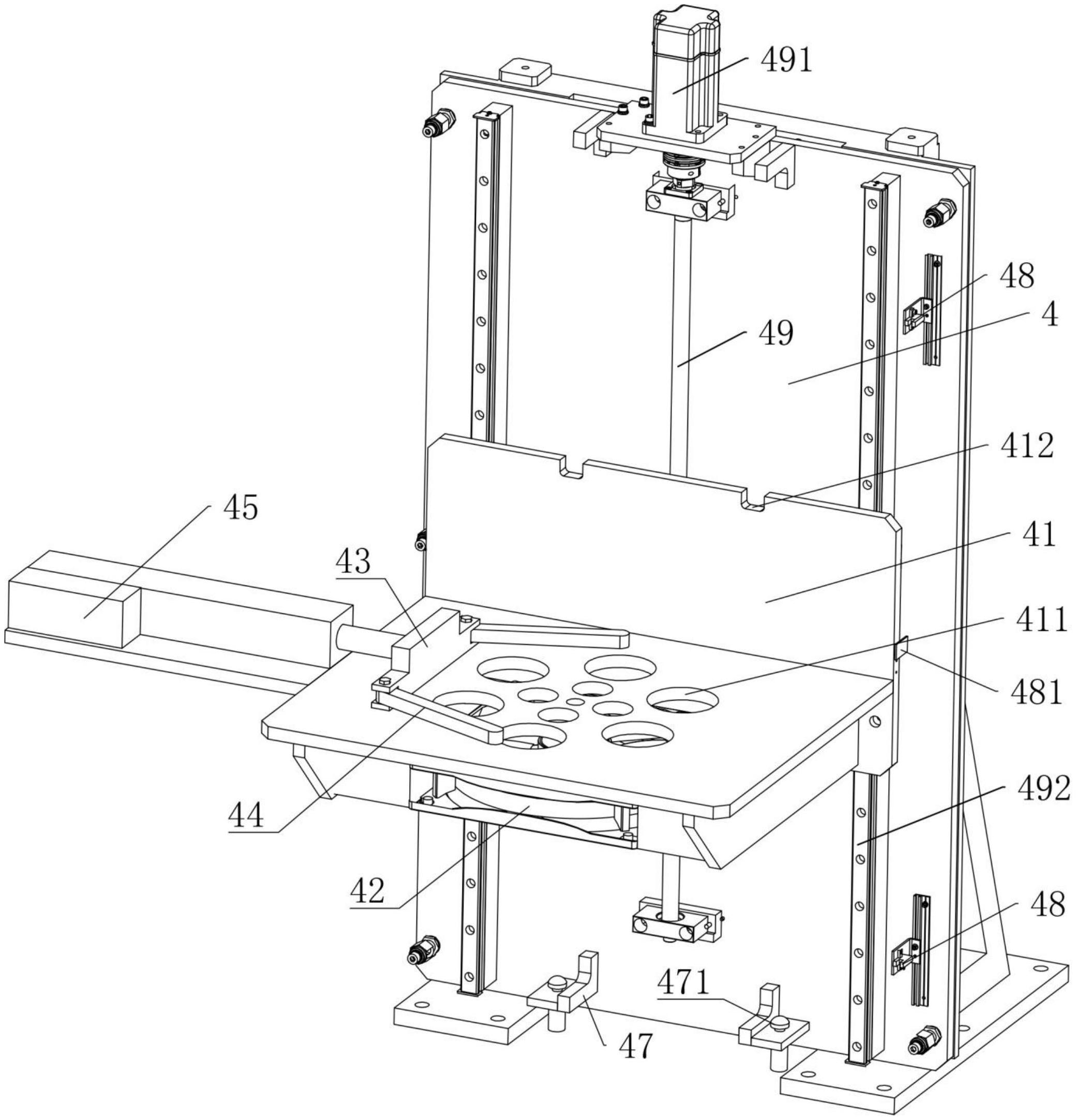 本实用新型公开了一种轮胎模具磨床的搬运组件,安装于磨床箱体的后端,包括支撑架、上下滑移安装于支撑架的升降板,升降板上设有若干组散热孔,升降板的下部安装有散热器,散热器与升降板之间留有间隙,升降板的一端设有推块、设置于推块两端的限位块及驱动推块运动的电动推杆二,所述支撑架相对于电动推杆二的一侧设有输送装置,升降板上下两端分别设有两道间隔设置的限位槽,支撑架设有与限位槽配合限位的限位架,下端限位架的两端分别安装有油压缓冲器,支撑架上安装有两组间隔设置的红外检测装置,升降板安装有红外检测装置配合遮挡块,通过上述设置,能将从磨床上卸下的轮胎模具搬运至设定位置。