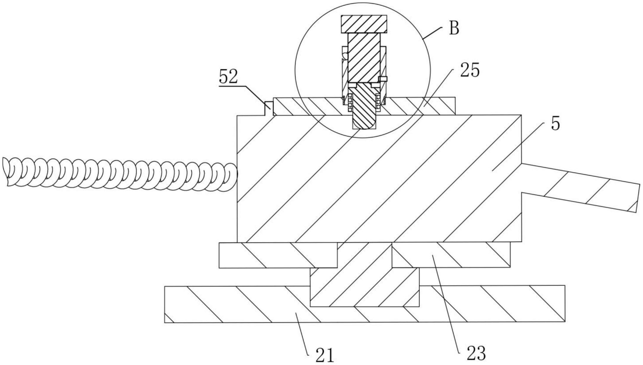 本实用新型公开了一种轮胎模具磨床的除杂组件,包括安装架、设于安装架上的支撑盘及驱动支撑盘上下运动的电动推杆一,底座上设有驱动安装架在底座上左右滑移的第一滑移组件,支撑盘上转动安装有转盘及与转盘啮合传动的驱动盘,转盘上安装有用于安装气枪的凵型架,凵型架的上端螺纹连接有套环,套环内安装有销轴,气枪上部设有与销轴定位配合的定位孔,销轴径向设有凸缘,凸缘与凵型架内端之间抵接有第一弹簧,套环设有贯穿套环周壁的弧形槽,弧形槽的下部设有竖直部且竖直部的上端高于弧形槽的下端,销轴的上端设有转头,转头的下部设有延伸至弧形槽的直销,通过上述设置,不需要工作人员手持操作,提高了操作便捷性。