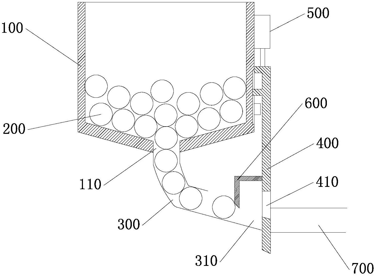 本实用新型公开了一种铸造件传输装置,包括:投料斗,用于投放铸造管,投料斗的底部设有料斗出口;传输通道,传输通道具有通道入口和通道出口,通道入口和料斗出口对接;控制挡板,控制挡板设置在通道出口,控制挡板上开设有过料孔,控制挡板和动力装置传动连接,以控制过料孔与通道出口接通或错开切换;隔断挡板,隔断挡板设置在控制挡板的前方,且和控制挡板间隔设置,隔断挡板和控制挡板之间的间隔能够容纳一根铸造管,隔断挡板和控制挡板同步运动,当过料孔与通道出口接通时,隔断挡板隔断传输通道的铸造管传输,当过料孔与通道出口错开时,隔断挡板撤去对传输通道的隔断;传输平台设置在通道出口和工作工位之间。