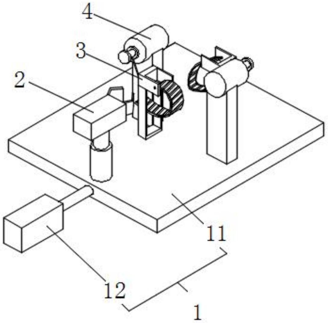 本实用新型公开了一种数控车床用自动顶料装置,其包括顶料机构以及辅助夹持结构、两个所述束缚结构、收紧结构。顶料机构包括顶出板。辅助夹持结构固定安装在所述顶出板上;所述辅助夹持结构包括第二伸缩气缸和固定安装在所述第二伸缩气缸顶部输出端的手指气缸。两个所述束缚结构对称设置在所述顶出板上。每个所述束缚结构包括回型固定架、固定安装在所述回型固定架顶端的U型支撑块和转动连接在所述U型支撑块内侧的滚子链条。本实用新型一种数控车床用自动顶料装置,其可适用不规则形状工件夹持顶料的使用,夹持稳定性高,有效避免了工件顶料产生角度的偏差,故提高了工件在数控车床上顶料加工的质量。