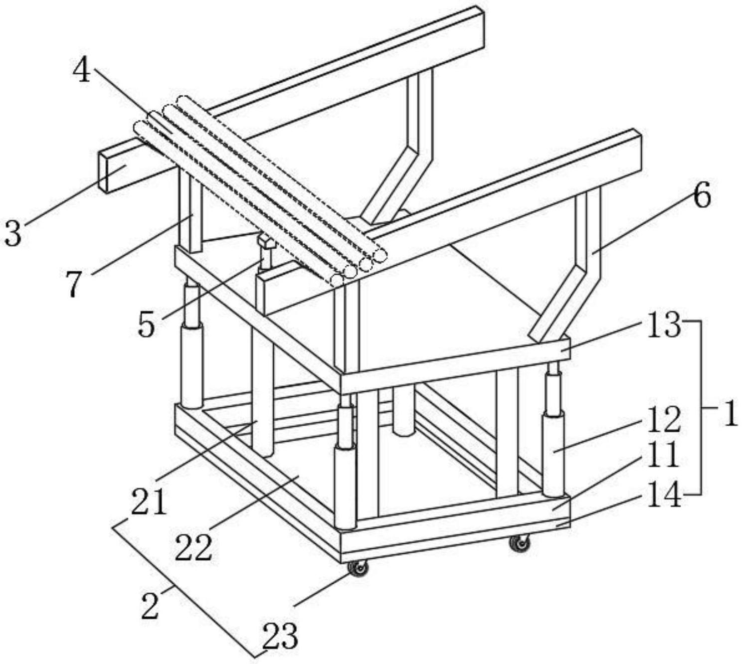 本实用新型公开了一种便于拿取的数控车床托料架,其包括功能支撑机构以及落地移动结构、两个托料结构、顶料结构。功能支撑机构包括落地框、固定安装在落地框上表面拐角处的电动推杆和固定安装在四个电动推杆输出端之间的支撑板。落地移动结构包括四个立柱、固定安装在四个立柱底端之间的移动板和固定安装在移动板下表面的四个落地移动轮。本实用新型在功能支撑机构满足托料结构加工位置承重的稳定下,通过功能支撑机构与落地移动结构的协同配合下,使得基于功能支撑机构上的托料结构可满足数控车床加工位置的灵活转移,有效实现了托料结构加工下料的稳定性及转移灵活性,故满足了数控车床工件下料加工的适用性。