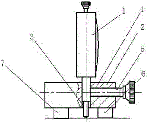 本发明涉及一种大型工件孔内环形槽深度测量装置及方法,属于大型工件测量领域。该装置包括百分表,设置一定位块,所述的定位块为一圆柱面被部分切掉形成一平面的和剩余柱面组成,在定位块平面上开设安装孔,安装孔的中心与圆柱的中心正交,定位块上开设定位孔与安装孔联通,百分表的测头套管从定位块平面一侧置于安装孔内,定位孔内设置紧固螺钉,该方法包括步骤:(a)组装量具:百分表与所述定位块组装;(b)调整量具:根据所测槽的深度调整测头位置;(c)测量:将调整好的量具置于要测量的工件孔内,完成测量。本发明结构简单,成本低廉,测量准确,能够满足加工测量要求。