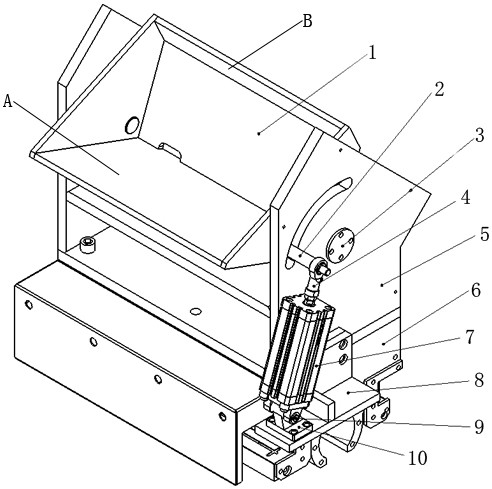 本实用新型提供了一种数控车床废料自动收集装置,包括支撑架、翻斗、驱动机构,所述支撑架固定在尾座体上,所述支撑架上开设有U型长孔,所述翻斗与支撑架转动连接,所述驱动机构一端与尾座体固定连接,另一端穿过U型长孔与翻斗固定连接,所述翻斗横截面为梯形,所述翻斗的前侧面高于后侧面,本实用新型实现了将切断的工件废料与铁屑分开放置,无需人工分拣,提高了生产效率,整个过程自动化操作,无需增加人力,降低了劳动强度。