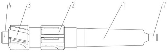 本实用新型属于精密加工领域,具体涉及的是一种短圆柱通孔用的孔加工刀具。相对于现有技术,本实用新型使用复合刀具加工短圆柱通孔,使该孔的加工由三个工步缩减集中为两个工步。使用复合扩铰刀,缩减了加工工序,减少了装卸刀具辅助时间,提高了生产效率。刀具结构紧凑,使用操作简单,敲击头的设置,有效提高了刀具耐用度。