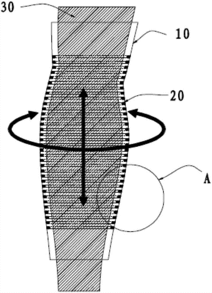 一种束套,包括:束套本体和涂层,所述束套本体具有靠近人体的内侧表面和远离人体的外侧表面,所述涂层设于束套本体内侧表面。涂层在平行于体表的方向产生的张力限制与传统束套的效果相同,并且,由于涂层设于束套本体内侧表面,因此,当人们穿戴束套时,其人体部分所产生的张力将涂层往垂直于体表的方向压制,涂层为了复位从而产生垂直于体表方向的力,进而产生垂直于体表方向的加压效果。