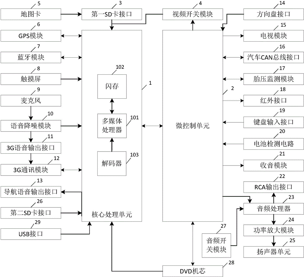 本实用新型涉及汽车电子技术领域,尤其涉及一种车载智能信息平台系统。该系统包括核心处理单元及微控制单元;所述核心处理单元包括多媒体处理器以及与该多媒体处理器连接的解码器及闪存;所述核心处理单元通过UART接口与GPS模块连接,并连接有蓝牙模块、3G通讯模块、触摸屏、导航语音输出接口。本实用新型提供的车载智能信息平台系统将GPS导航与移动通信相融合,同时配备了触摸屏用于显示及输入,配备导航语音输出接口用于输出导航语音,实现了导航与移动通信的互联互通。