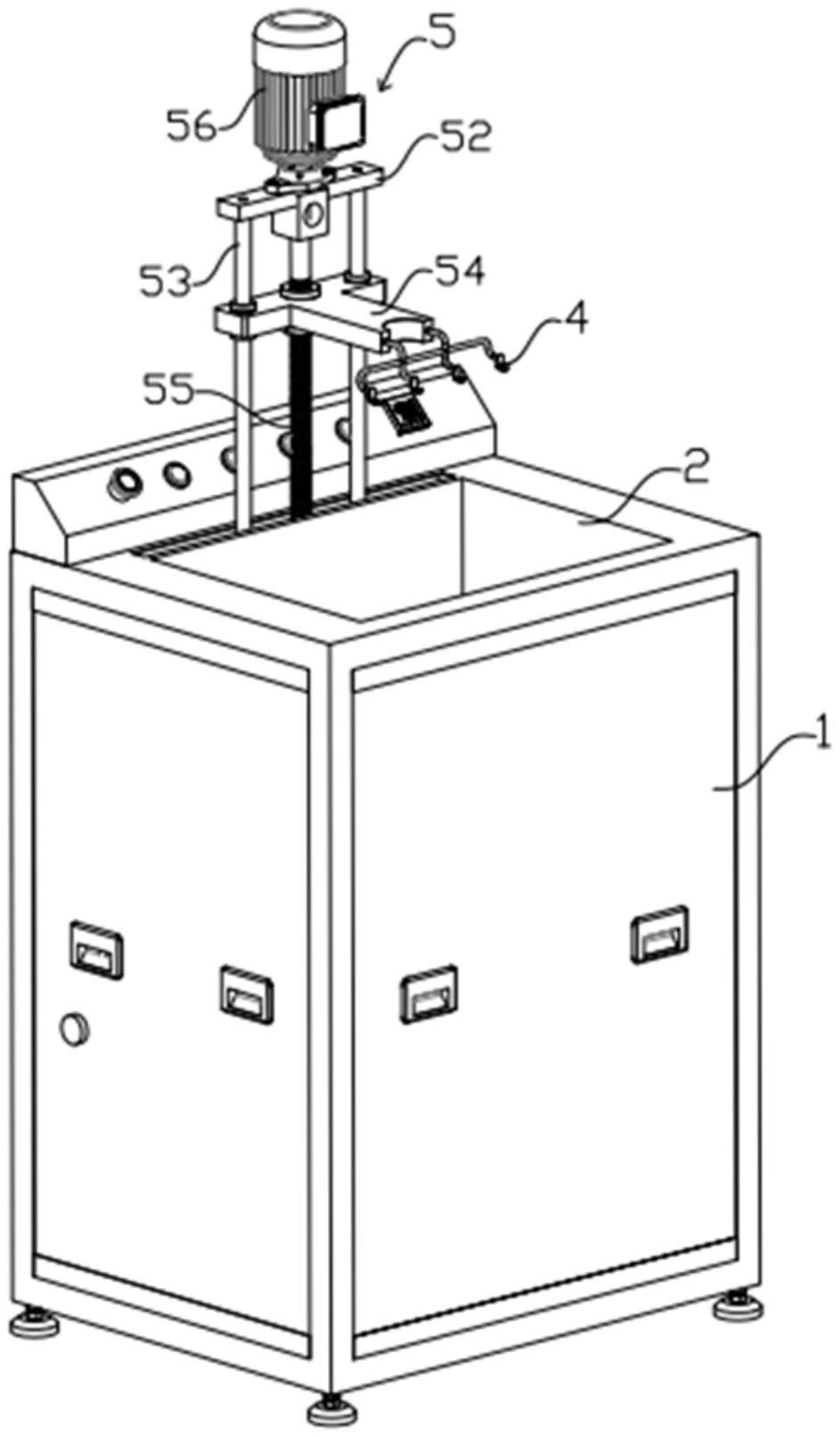 本实用新型涉及麦绿素护色处理技术领域,公开了麦绿素护色处理设备,包括机箱(1)及机箱(1)内设有护色处理槽(2),护色处理槽(2)的一侧设有下出水口(21)及上进水口(22),还包括用于放置大麦苗的放料框(3)、挂放放料框(3)的挂架(4)及带动挂架(4)移动的驱动组件,驱动组件包括带动挂架(4)上下升降的第一驱动组件(5),便于取放放料框(3)内的大麦苗;该护色处理设备通过更换护色液在护色处理槽进行多次护色处理,设置的驱动组件带动放置大麦苗的放料框进行上下升降,以便大麦苗完全进入护色液中,操作简便,不需要来回转移大麦苗。