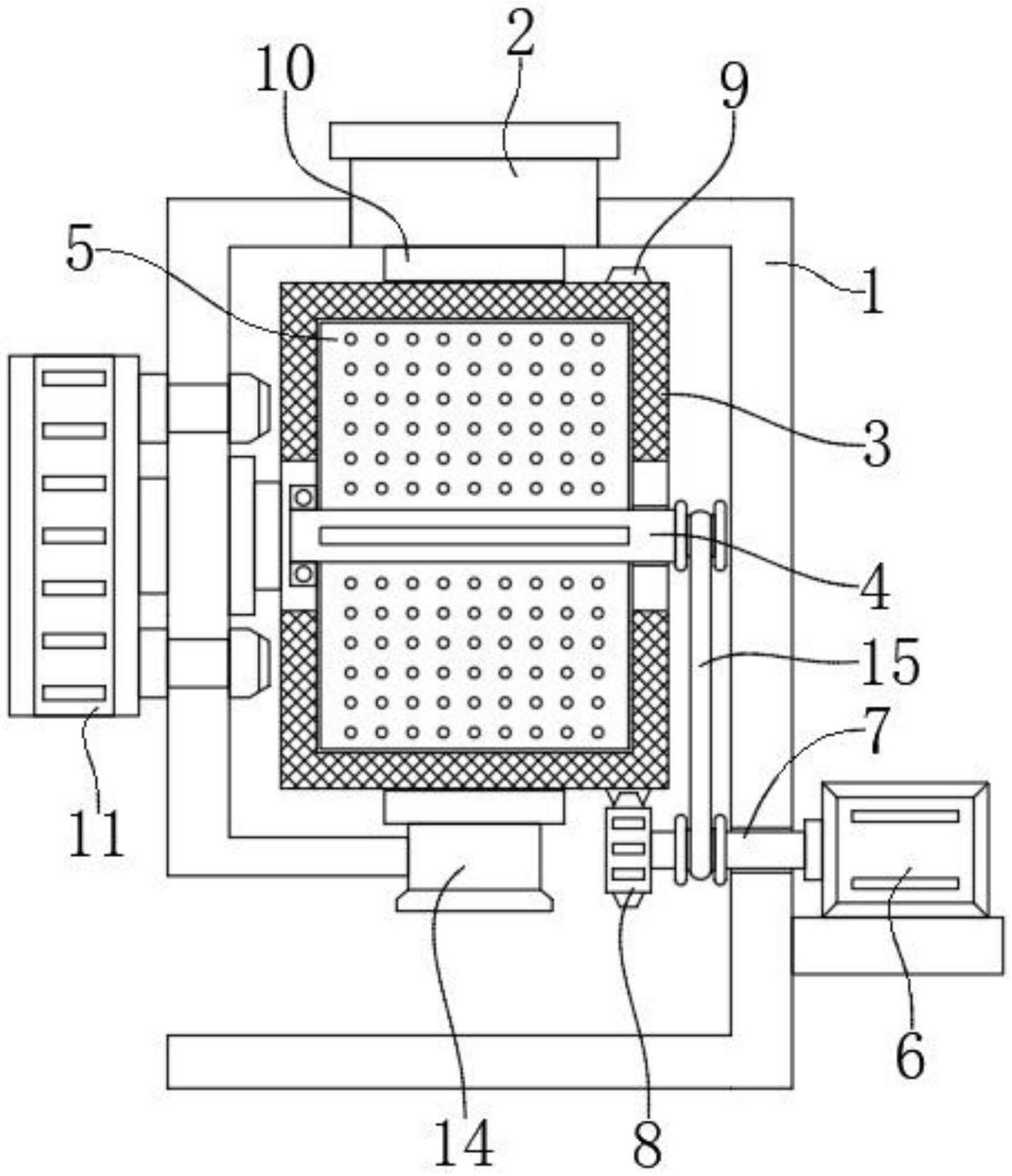 本实用新型公开了一种物料悬浮烘干装置,所述烘干箱的顶部固定有储料箱,所述烘干箱的内部旋转固定有烘干筒,所述烘干筒的表面设置为网状,所述烘干筒的内部固定有固定轴,所述固定轴的外侧固定有挡板,所述烘干箱的后侧固定有电机,所述电机的输出轴固定连接有传动轴。本实用新型通过设置有烘干筒,该装置通过烘干风机对烘干筒内的物料进行烘干,通过电机驱动与各组件之间配合带动烘干筒持续旋转,通过此设置可使物料在烘干筒的内部翻倒,物料在烘干风机的作用下翻转并飞扬,以此来实现悬浮烘干,有效提高了物料的烘干效率,同时旋转的烘干筒与储料箱以及出料口配合可实现自动进出料,使该烘干装置使用时更加省时省力。