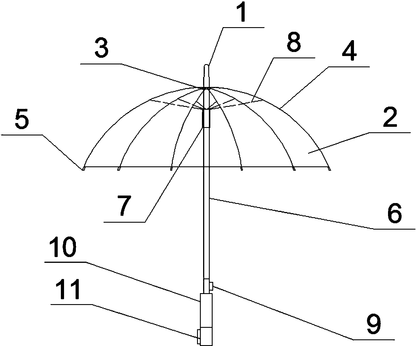 本实用新型公开了一种带照明装置的伞,包括伞头、伞布、铰接座、伞骨、伞珠、伞柱、推环、支撑杆、开关装置、伞柄及照明装置,伞头底部与铰接座顶端相连,伞布中心位置固定安装于伞头与铰接座连接处,铰接座外侧与伞骨一端相连,伞骨有若干个,伞骨两两之间的距离一致,伞骨另一端固定安装有伞珠,伞骨固定安装于伞布下表面,铰接座下表面中心位置与伞柱顶端相连,伞柱外侧设置有推环,推环外沿均匀连接有支撑杆,支撑杆远离连接推环一端与伞骨中心位置相连,伞柱另一端与开关装置顶端相连,开关装置底端与伞柄顶端相连,伞柄底端与照明装置相连,该实用新型结构合理,在挡雨的同时也能提供照明,即方便又实用。