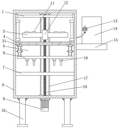 本实用新型公开了一种具有对包装灭菌功能的牛奶灌装设备,涉及牛奶生产设备技术领域。一种具有对包装灭菌功能的牛奶灌装设备,包括箱体,所述箱体内部依次设置有第一隔板和第二隔板,所述箱体顶部设有红外线灯,所述第一隔板包括U形板,所述U形板两侧均设有定位电机,所述定位电机输出端固定连接有定位丝杠,所述定位丝杠另一端螺接有定位滑块,且定位滑块底部固定连接有气缸,所述气缸底部固定连接有连接板,所述连接板底部均匀设有紫外线灯。本实用新型红外线灯、紫外线灯和置物板等结构,能够实现有效的对包装瓶进行灭菌,灭菌效果好,且灭菌过程简单、快捷。