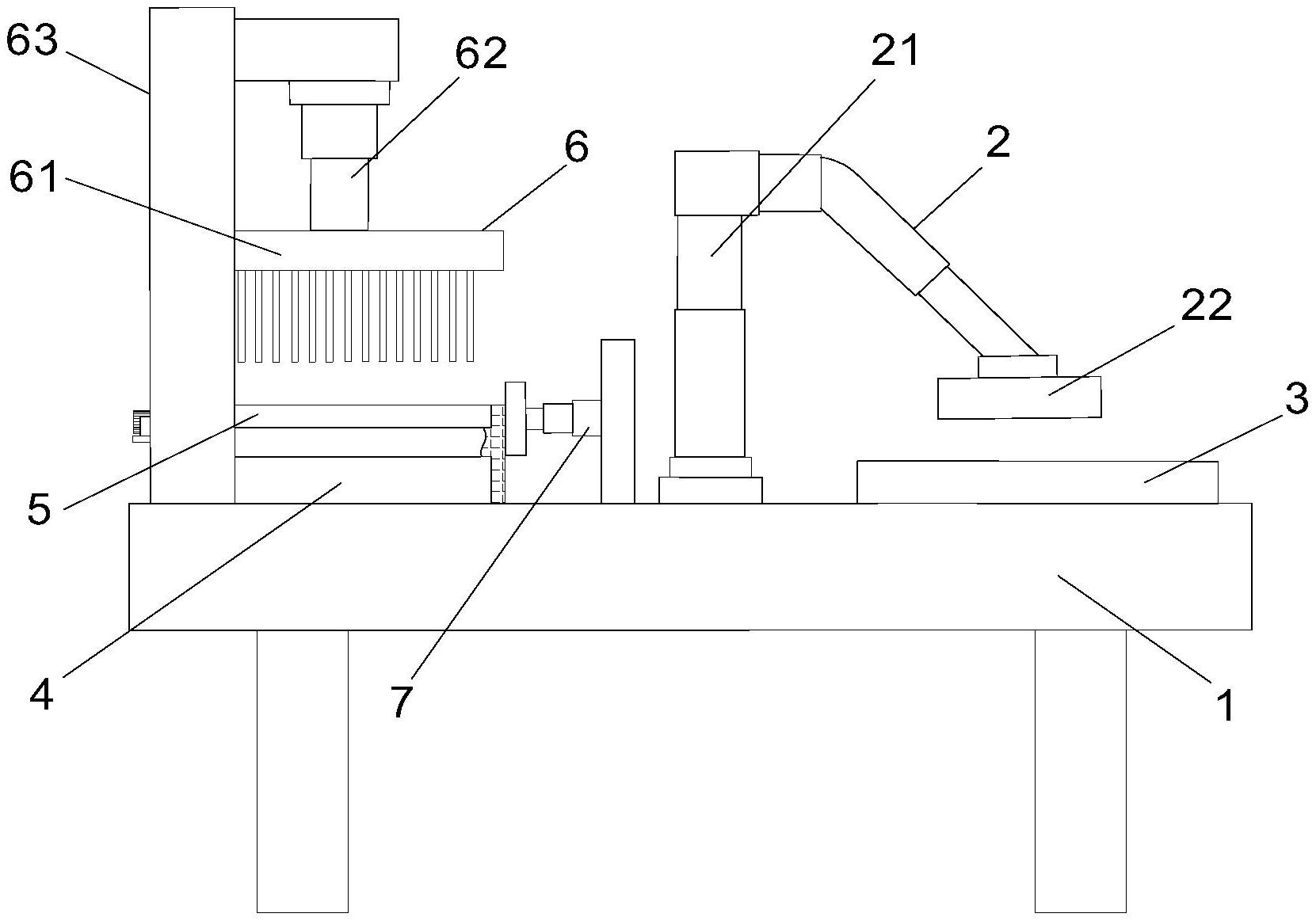 本实用新型涉及一种牛奶生产用配料分切装置,属于配料分切技术领域,包括支撑台,所述支撑台上设置有运输机构,所述运输机构的两侧分别设置有放置台和切割台,所述切割台的上方设置有压紧机构和分切机构,所述压紧机构位于分切机构下方;所述压紧机构包括压板,所述压板通过翻转装置安装在支撑架上,所述支撑架设置在支撑台上,所述压板上均匀开设有第一切槽,所述切割台上均匀开设有第二切槽,所述分切机构分别与第一切槽和第二切槽相匹配。本实用新型通过运输机构将蔬菜转移到切割台上,并通过压紧机构固定,可以防止分切时蔬菜移动;通过开设第一切槽和第二切槽,并通过分切刀一次性完成蔬菜的分切,提高了分切效率。