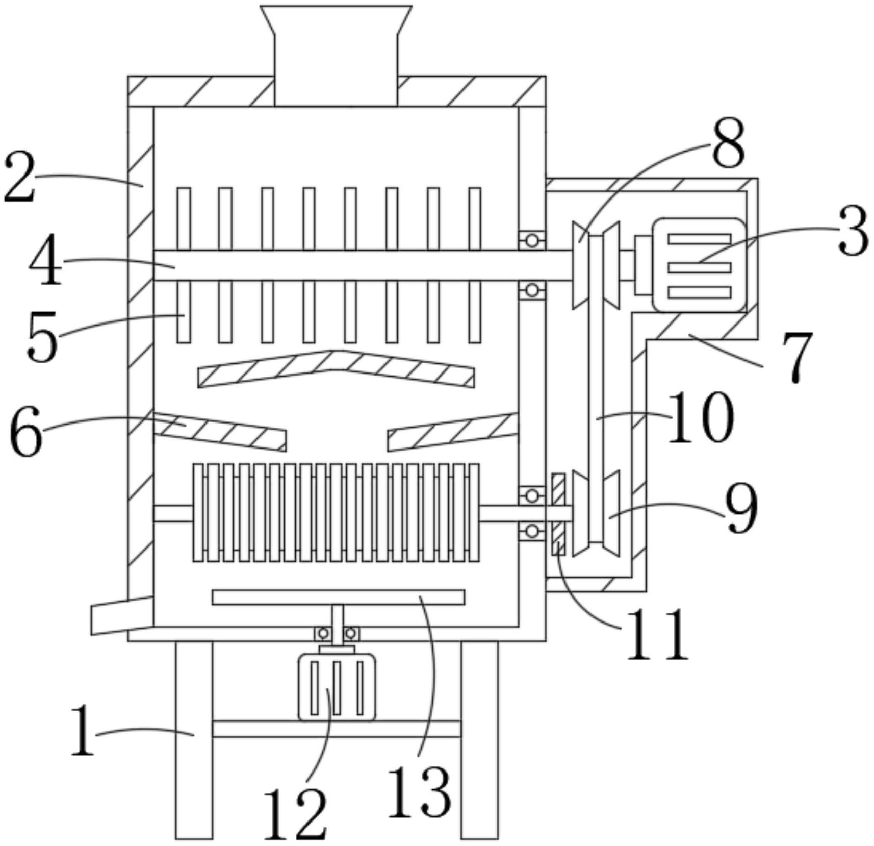 本实用新型公开了一种高效塑料结粒机,包括支架,其所述支架的上端固定安装有箱体,所述第一电机固定安装于固定箱的侧壁,所述第一电机输出轴的一端键连接有搅拌轴,所述第一皮带轮通过皮带与第二皮带轮传动连接,所述第二皮带轮的侧壁固定安装有第一旋转轴,所述第一齿轮与第二齿轮啮合,所述第二齿轮的侧壁固定安装有第二旋转轴,所述支架的侧壁固定安装有第二电机。通过第一搅拌刀与第二搅拌刀配合,使搅拌粉碎更均匀,第一挤压轮与两组第二挤压轮配合,能同时挤压两组物料,一定程度上提高了工作效率,通过第一电机带动进行搅拌工作和挤压工作,一定程度上节约了能源,降低了生产成本。