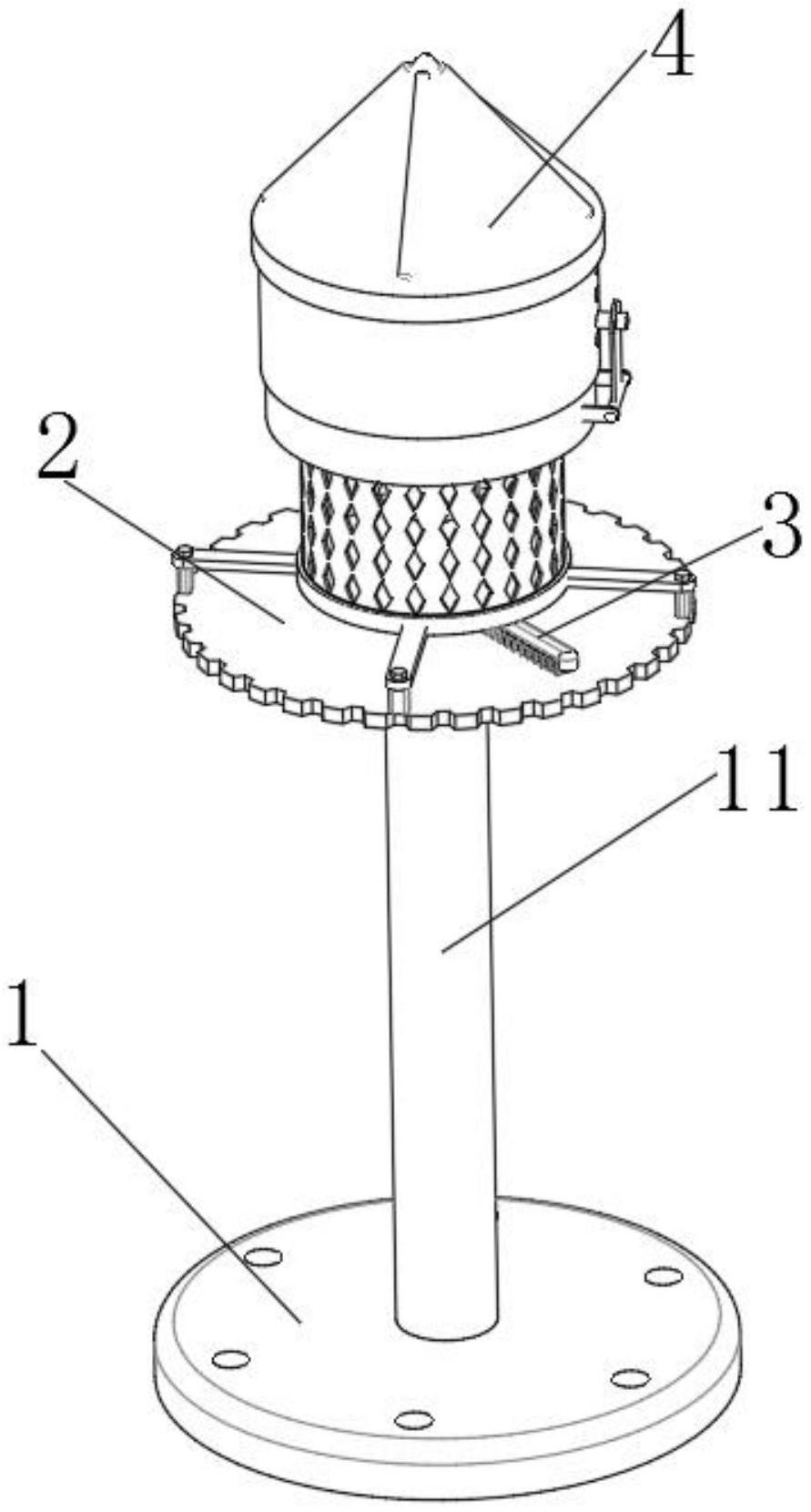 本实用新型公开了一种太阳能自洁式杀虫灯,具体涉及杀虫技术领域,包括底座,所述底座顶部设置有用于安装诱虫灯的固定组件,所述底座顶部固定连接有用于连接固定组件的支撑杆,所述支撑杆顶部与固定组件固定连接,所述固定组件底部设置有用于清洁蚊虫的清扫组件,所述清扫组件设置于支撑杆顶部,所述固定组件顶部设置有用于保护装置装置遮蔽组件,本实用新型中设置有清洁组件,电动机的输出端与连接杆固定连接,连接杆底部固定连接有多个用于清扫台面的扫毛,太阳能盖板底部外侧固定连接有用于安装伸缩环的套筒,套筒内壁与伸缩环表面滑动连接,可以自动清扫蚊虫,便于维护,伸缩环将电网笼罩,保护整体装置,防止雨水侵蚀,提高使用寿命。