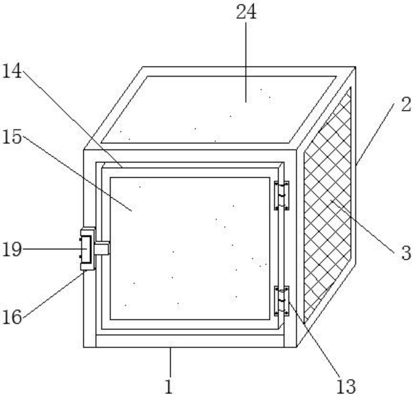 本实用新型的一种蚊子观察笼,属于蚊子科普课程教具技术领域,包括底板、框架和网纱蚊帐;所述底板一侧连接有框架,所述框架侧面连接有第一网纱蚊帐,所述框架顶部连接有第二透明膜,所述底板顶部吸附有吸盘,所述吸盘顶部连接有蚊蛹饲养盒;所述第一网纱蚊帐背面连接有固定环,所述固定环一侧连接有外环,所述外环内部开设有螺纹槽。本实用新型的有益效果是在需要观察蚊子时,提前在笼底部放入蚊蛹饲养盒,待蚊子孵化出来时放入沾有糖水的棉球,便于蚊子长期生存;拉动密封框可以使其通过铰链向一侧进行翻转,进而密封框会带动固定块与连接块分离,由此可以将密封框打开,从而可以将观察笼内的蚊子放出。