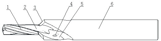 一种小直径大径差阶梯钻,涉及金属切削刀具领域,包括切削刃部和钻柄部,切削刃部包括与钻尖一体的第一切削刃段和第二切削刃段,其特征在于第一切削刃段处和第二切削刃段处设有第一容屑槽,钻柄部的前部设有与第一容屑槽相连、螺旋角度相同的第二容屑槽,第二容屑槽与切削刃部轴线间的距离大于第一容屑槽与切削刃部轴线间的距离;钻柄部后端与第二容屑槽间设有螺旋内冷通道,螺旋内冷通道的出液口位于第二容屑槽内。本实用新型具有提高整体强度、不易断裂损坏等优点。