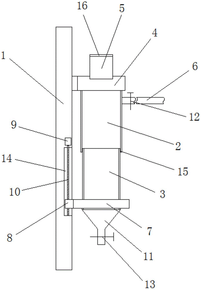 本实用新型公开了一种洗涤剂的可调节定量添加机构,包括安装板,所述安装板的上部右侧固定安装有固定架,所述固定架的底部固定连接有套桶,所述套桶的顶部固定安装有气泵,所述套桶右侧顶部固定连接有添加管,所述安装板的右侧下部开设有定位轨的顶部固定安装有电机,所述电机的底部固定连接有丝杆连接有螺纹套筒,所述螺纹套筒与定位轨活动卡接,所述螺纹套筒的右侧固定连接有移动架,所述移动架上活动连接有伸缩桶,所述伸缩桶的顶部与套桶的底部相互套接,所述伸缩桶的底部固定连接有添加嘴,本实用新型涉及洗涤剂添加领域,结构简单,方便实用,能够根据实际情况的需要,调节控制洗涤剂的添加量。