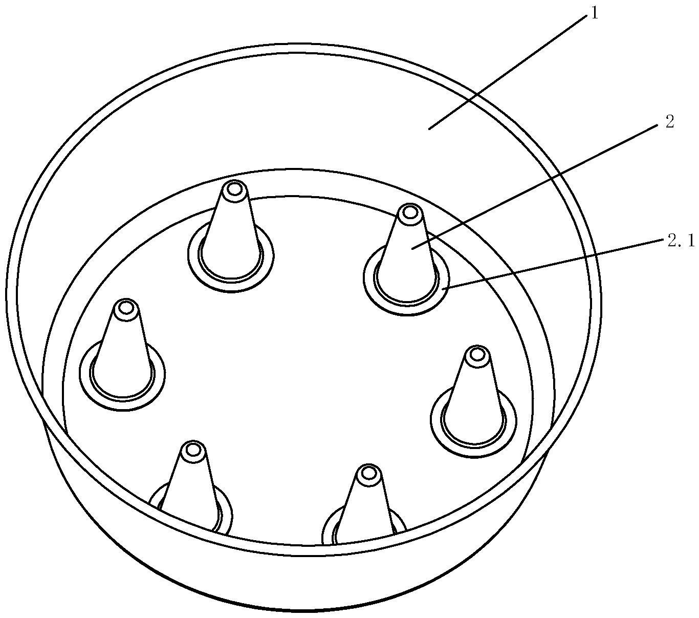 本实用新型组合蛋糕烤盘,包括烤盘,所述烤盘内腔放置一个以上呈锥形的辅助爬升柱;所述辅助爬升柱的高度小于烤盘的深度;所述辅助爬升柱的底部设有翻边。本实用新型具有以下有益效果:结构简单,通过增加辅助爬升柱,给蛋糕爬升提供支撑点,让蛋糕在烘烤过程中可以轻松往上膨胀;同时,可使蛋糕受热更均匀。