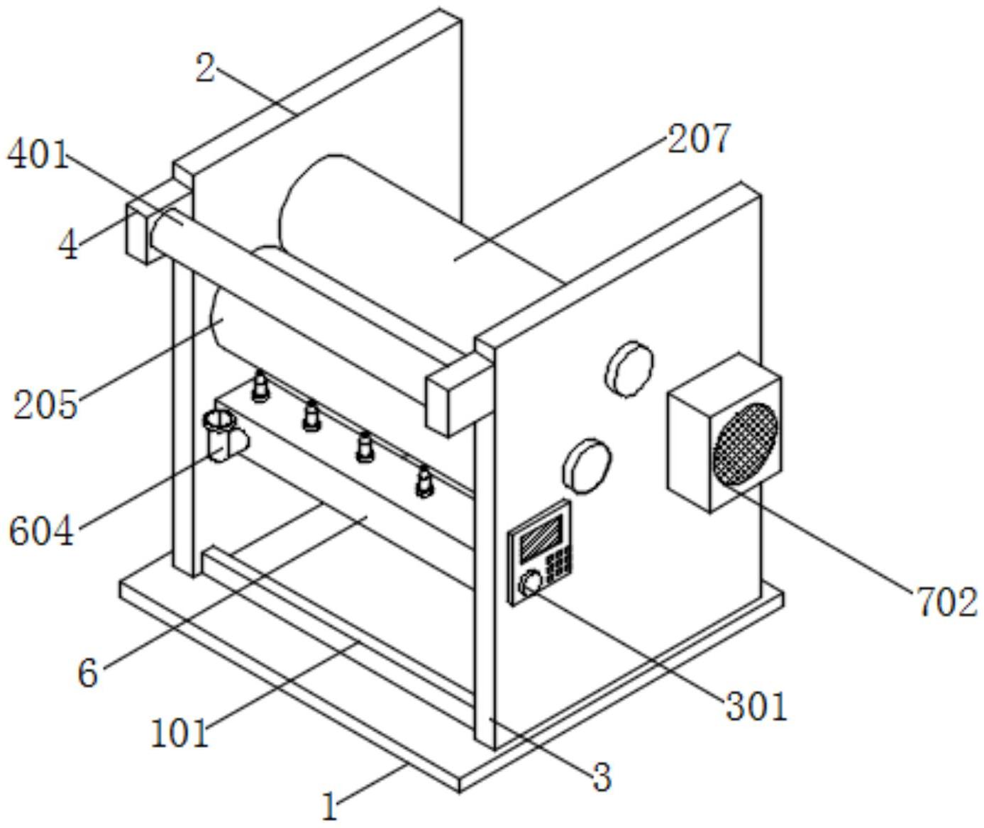 本实用新型公开了一种施胶均匀的膜转移施胶机,包括底板、第一安装板和第二安装板,所述底板的顶部安装有第一安装板,所述第一安装板的一侧安装有第二安装板,所述第一安装板的一侧对称安装有固定条,所述固定条的底部安装有胶料收集盒,所述第一安装板的一侧安装有多个刮筒,且刮筒位于胶料收集盒的上方,所述第二安装板的一侧开设有热风烘干口,所述热风烘干口的内部安装有多根电热丝。本实用新型通过施胶辊和压胶辊转动挤压下进行初步均匀处理,继而纸张会被连续的三个刮筒的刮涂,将纸张上不均匀施胶造成的多余胶料刮下,同时风机吹出的风在电热丝的加热下变成微热的风,即可对纸张上的胶料进行速干,提高了该膜转移施胶机涂胶成品的质量。