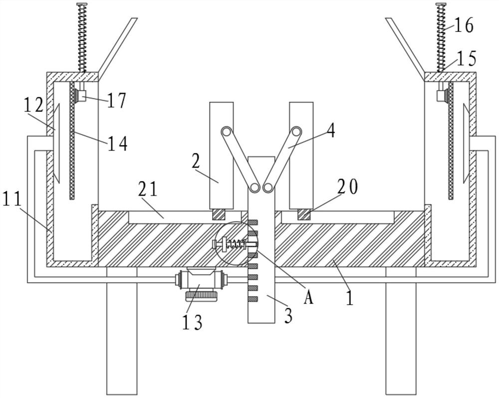 本实用新型涉及旋耕机旋刀生产技术领域,具体涉及一种旋耕机旋刀生产用打磨装置,包括固定架,固定架的顶部设置有夹持机构,且固定架的两侧设置有集尘机构,固定架顶部远离夹持机构的一端安装有气缸,且气缸的顶部设置有与夹持机构相配合的打磨机构,弹簧、调节孔、插销,固定架的顶部滑动连接有两组夹板,且固定架的一端滑动连接有调节杆,调节杆的外侧转动连接有连杆,本实用新型通过拉动拉杆使插销远离调节孔,再拉动调节杆滑动,调节杆通过带动连杆转动使夹板相对方向滑动,当夹板对物料夹持后,松开拉杆,调节弹簧推动插销复位插入调节孔中,从而使夹板对物料进行夹持固定,方便打磨机构对物料进行打磨。