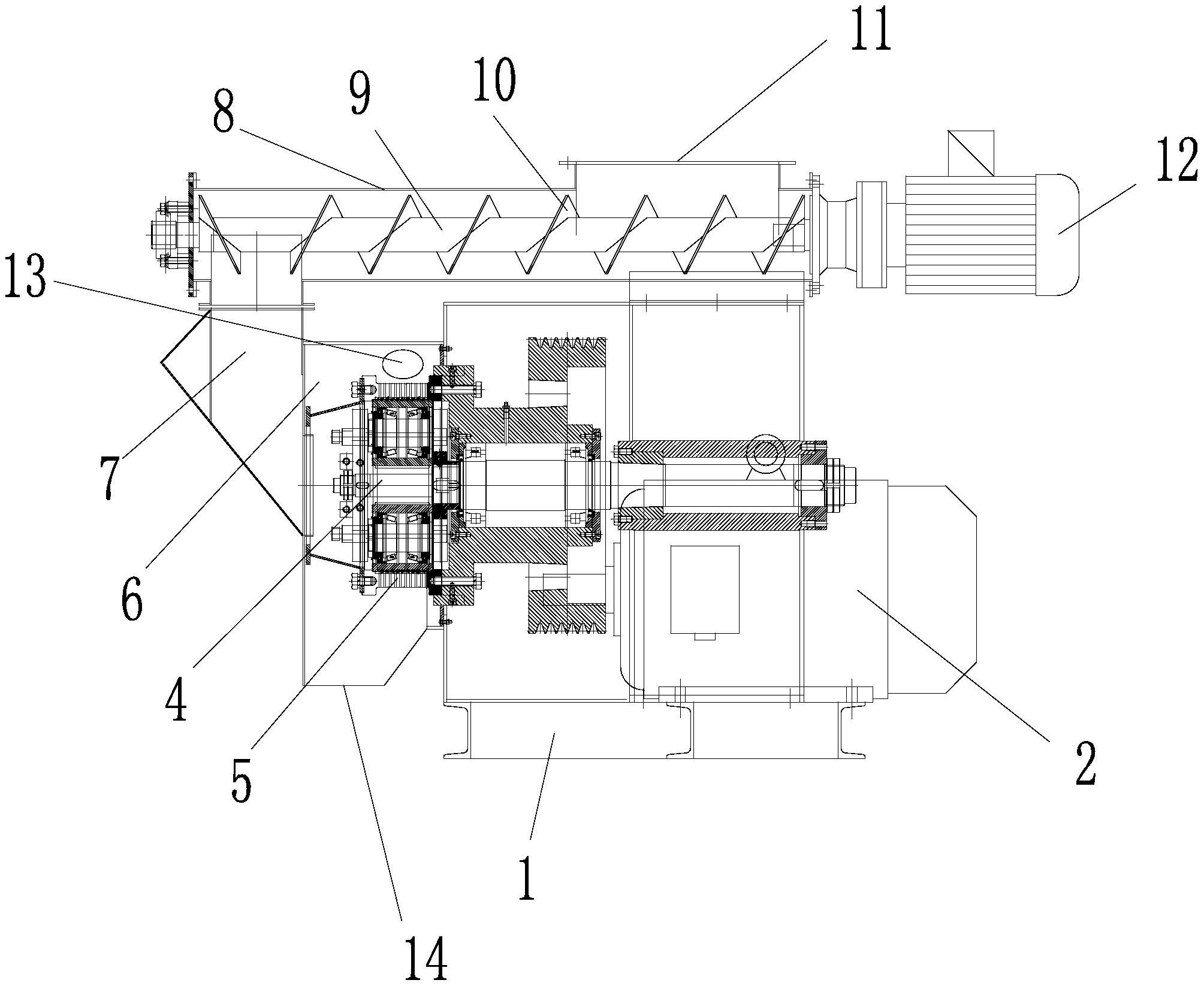 本实用新型涉及一种新型环模颗粒机,它包括基座,所述基座为平板结构,通过地脚螺栓固定在地面上,所述基座上设置有造粒电机,所述造粒电机通过传动带连接有压辊,并带动压辊转动,所述压辊的外侧设置有压模,所述基座上固定设置有护罩,所述压模设置在护罩内,所述护罩连接有下料通道,所述下料通道的上端连接有输送外壳,所述输送外壳的内部设置有输送轴,且输送轴连接有输送电机,所述输送外壳的上端设置有进料口;本实用新型具有体积小、结构合理和方便更换环模的优点。