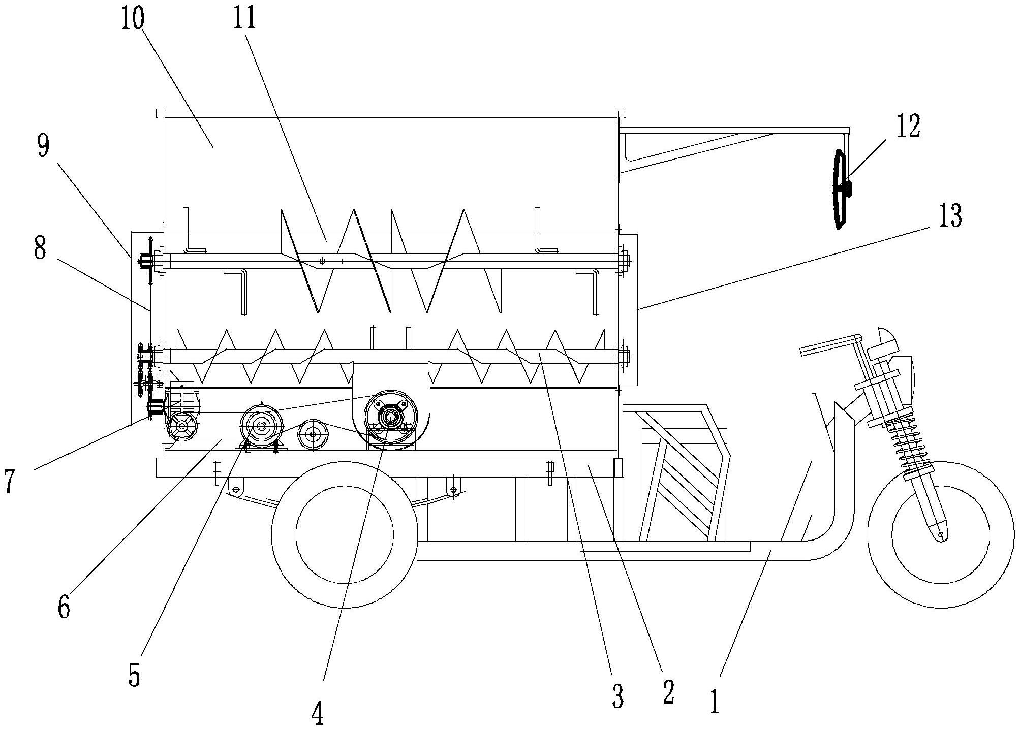 本实用新型涉及一种用于撒料的新型电动三轮车,它包括三轮车本体,所述三轮车本体上设计有车架,所述车架的上端面固定连接有料斗,所述料斗为空壳结构,所述料斗的内部水平设置有破拱轴,所述破拱轴通过轴承连接料斗,所述破拱轴的下方还设置有输送绞龙,所述输送绞龙与破拱轴平行,所述料斗的底部设置有通道,且通道与输送绞龙之间空间垂直,并设置在输送绞龙的下方,所述通道一端封闭,一端开口,且通道内设置有撒料绞龙,所述撒料绞龙与通道的封闭端之间轴承连接;本实用新型具有不堵塞、结构简单合理的优点。