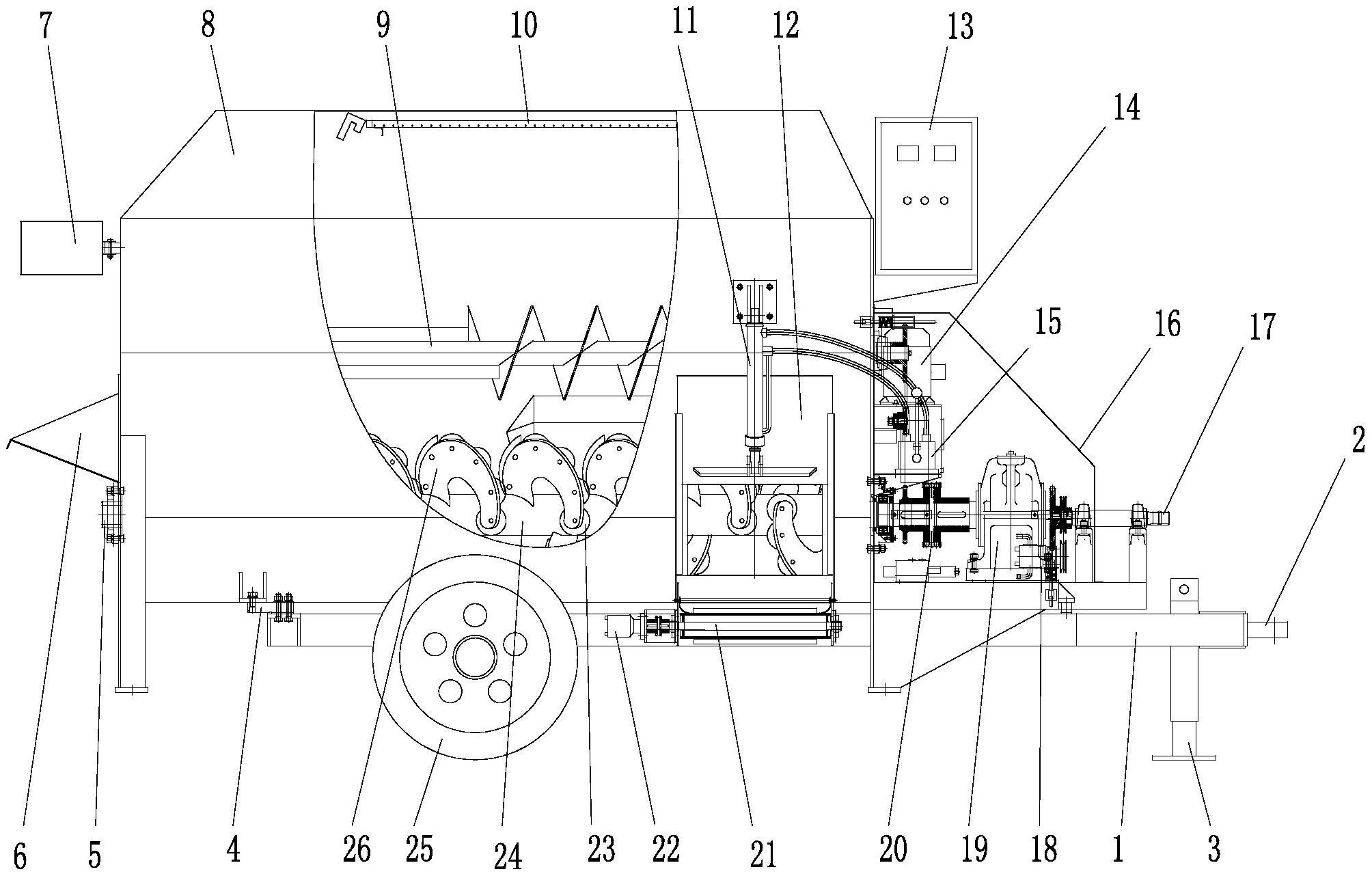 本实用新型涉及一种牵引式搅拌撒料机,它包括车架,所述车架的上端设置有料仓,所述料仓的端面通过轴承安装有搅拌轴,所述搅拌轴的右端通过联轴器连接有减速机,所述减速机连接有电机,所述车架的右端设置有牵引钩,所述车架的下端面设置有升降支腿,所述车架的侧面设置有撒料皮带机,所述撒料皮带机与车架前进的方向垂直,且散料皮带机的外部通过板固定在料仓的侧面;本实用新型具有使用方便、结构合理的优点。