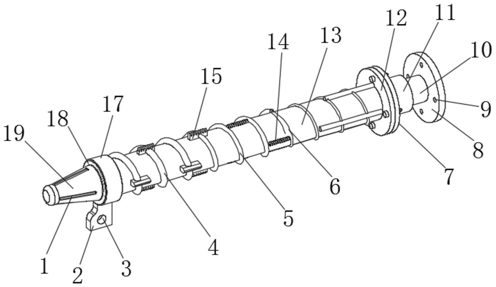 本发明公开了一种高效的玉米收获机割台用摘穗机构,包括中空柱体,所述中空柱体的右端面设有第二法兰盘,第二法兰盘通过设置在其右端面的定位螺栓固定连接有第一法兰盘,第一法兰盘的右侧面中部设有套轴,套轴通过设置在其内侧面的轴承转动连接有中空连接轴,中空连接轴的右端面设有第三法兰盘,本高效的玉米收获机割台用摘穗机构,使用时果穗啃伤少、破碎率低、能撕去部分果穗苞叶,达到很好的摘穗效果,拉茎螺旋筋直径分段变化,摘穗效率高,不损伤果穗,拉茎速度快,径向筋的设置可以有效提高玉米叶的下拉速度,锯齿形拉茎钉的设置可以有效减少了茎秆和摘穗辊之间相互滑动,同时可以提高拉茎速度,有效预防堵塞。