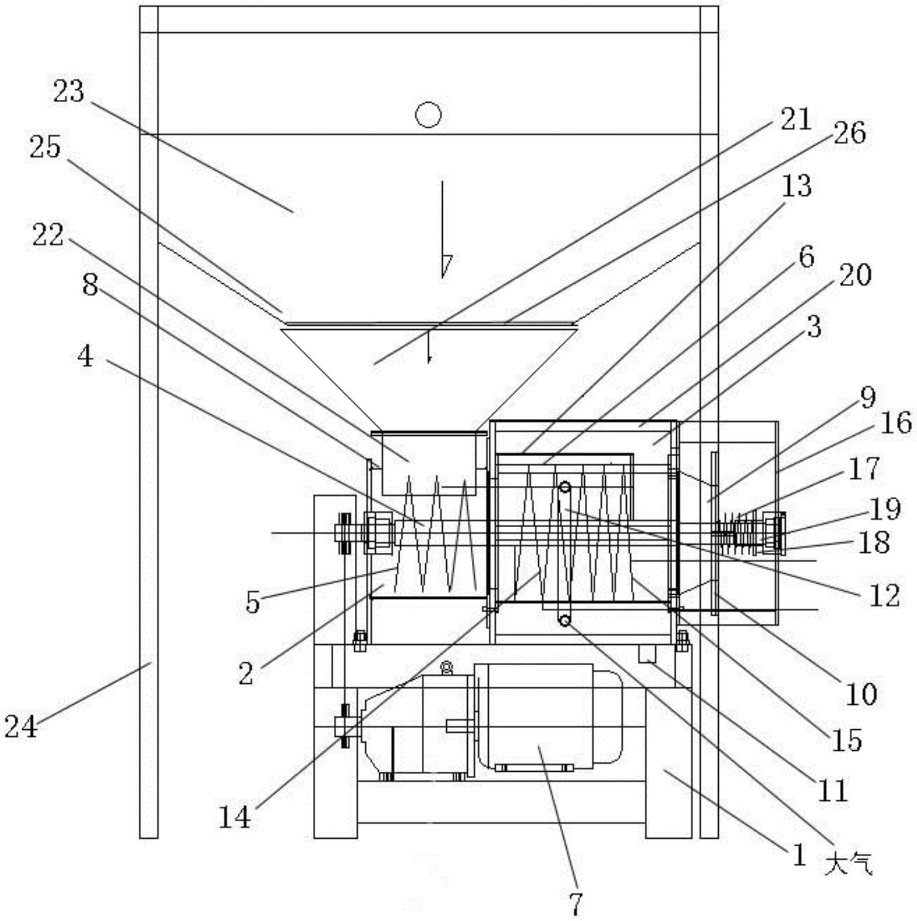 本实用新型旨在提供一种负压式污泥处理机,包括机座、驱动机构、输送仓、压榨仓、转动轴、输送螺旋叶片、筛网筒、压榨螺旋叶片总成;机座顶面上沿由左到右的方向依次设置输送仓和压榨仓,输送仓的顶部设有进料口;压榨仓的出料口设于其右侧,其上设有封盖;转动轴的左端或右端通过传动装置与驱动机构;位于输送仓内的转动轴上设置输送螺旋叶片,位于压榨仓内的转动轴上设有压榨螺旋叶片总成;筛网筒与压榨螺旋叶片总成间隙配合;压榨仓底部设有接口,通过管路与连接;输送仓的上部或中部设有进气管,该进气管连通大气。本实用新型结构设计科学合理,维护成本低,处理效率高,脱水效果好。