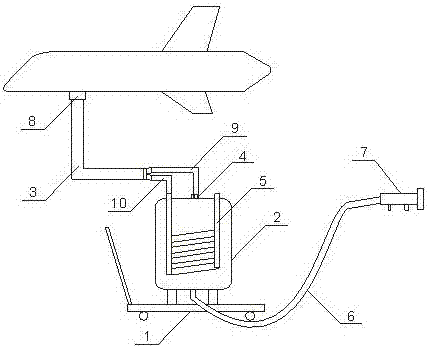 本实用新型公开了一种飞机用小型除冰装置,包括移动式底座、储液罐和供气管,在储液罐的顶部设有一进气接头,在储液罐内设有一加热盘管,在储液罐的底部设有一出液管,该出液管的一端与储液罐相连通,另一端与一喷枪相连通;所述供气管的一端具有能够与飞机的地面气源接头相连的气源连接接头,该气源连接接头内部设有两凸出于气源连接接头的顶针;该供气管的另一端通过三通同时与第一气管和第二气管的一端相连,其中,所述第一气管的另一端与储液罐顶部的进气接头相连,第二气管的另一端与加热盘管的进气端相连。本实用新型结构简单,体型小巧、操作灵活,成本更低,并且环保节能。
