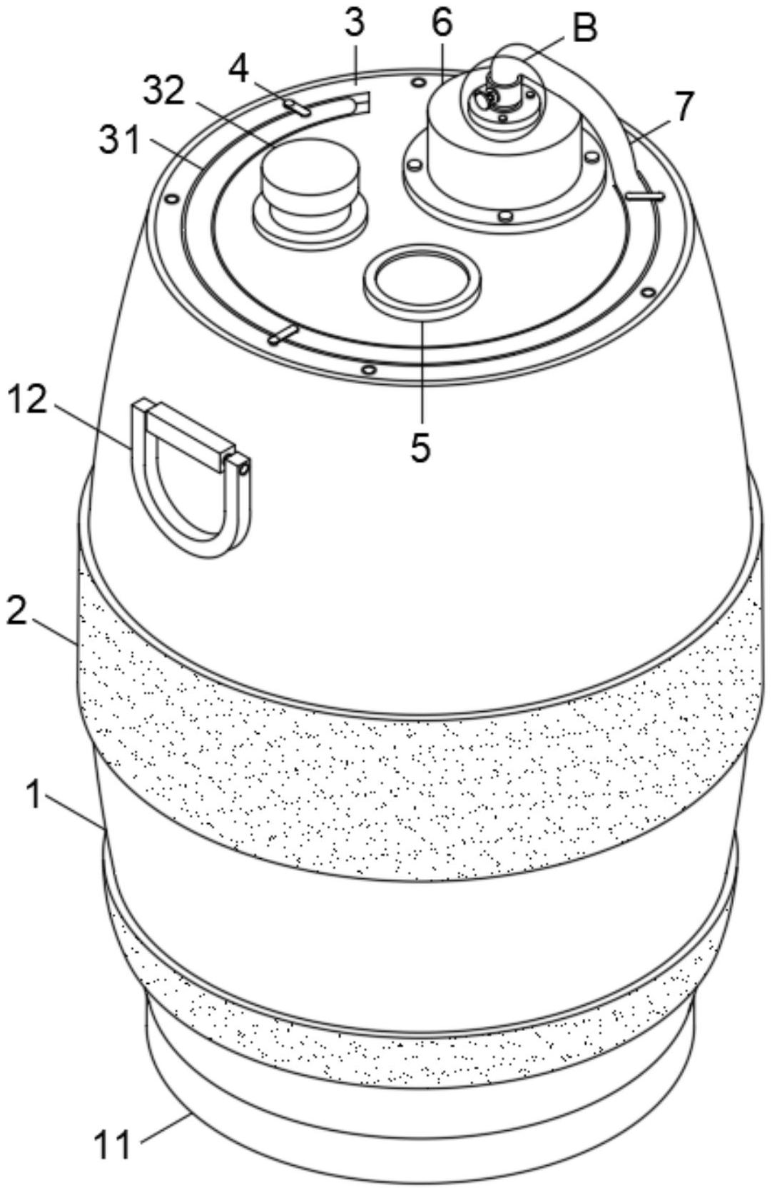 本实用新型公开了中性蛋白酶领域的一种中性蛋白酶储存装置,包括储存桶,储存桶外端壁上部两侧均安装有手提环,储存桶外端壁上下均设有包钢,储存桶上端设有上盖,上盖顶端壁设有凹槽,上盖上端安装有抽料泵,抽料泵上端安装有出料管;包钢为不锈钢扁钢,且包钢为套设在储存桶外端壁上下,使用时,通过包钢将储存桶外端壁凸出包裹,避免储存桶运输时受到挤压损坏,有效提高储存桶的强度和安全性能;并且抽料泵通过管道延伸至储存桶内底端,且抽料泵与出料管连通,使用时,启动抽料泵运行即可将储存桶内的中性蛋白酶抽出,并通过出料管导出,无需将上盖拆开手动出料,方便快捷,有效提高其功能性和实用性。