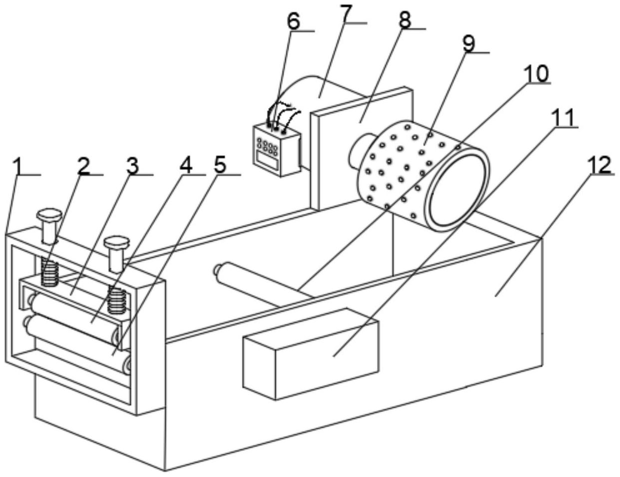 本实用新型公开了涉及生物抛光技术领域的一种纤维素酶生物抛光处理装置,包括抛光处理槽、固定框和定位板,抛光处理槽的一端焊接有固定框,固定框内顶部通过挤压弹簧连接有U形板且U形板内通过轴承安装有移动滚筒,抛光处理槽的顶端一侧焊接有定位板,定位板的一侧通过固定座安装有伺服电机,伺服电机的输出轴贯穿定位板连接有收卷筒,抛光处理槽内通过轴承安装有限位辊轴;该新型纤维素酶生物抛光处理装置便于将面料拉紧,具有烘干的效果,酶的作用是弱化微纤基端,但没有把它们和纱分离开,要靠机械作用力完成这一步,生物抛光是给予织物持久性的整理效果,实现生物抛光的作用,适合广泛推广使用。