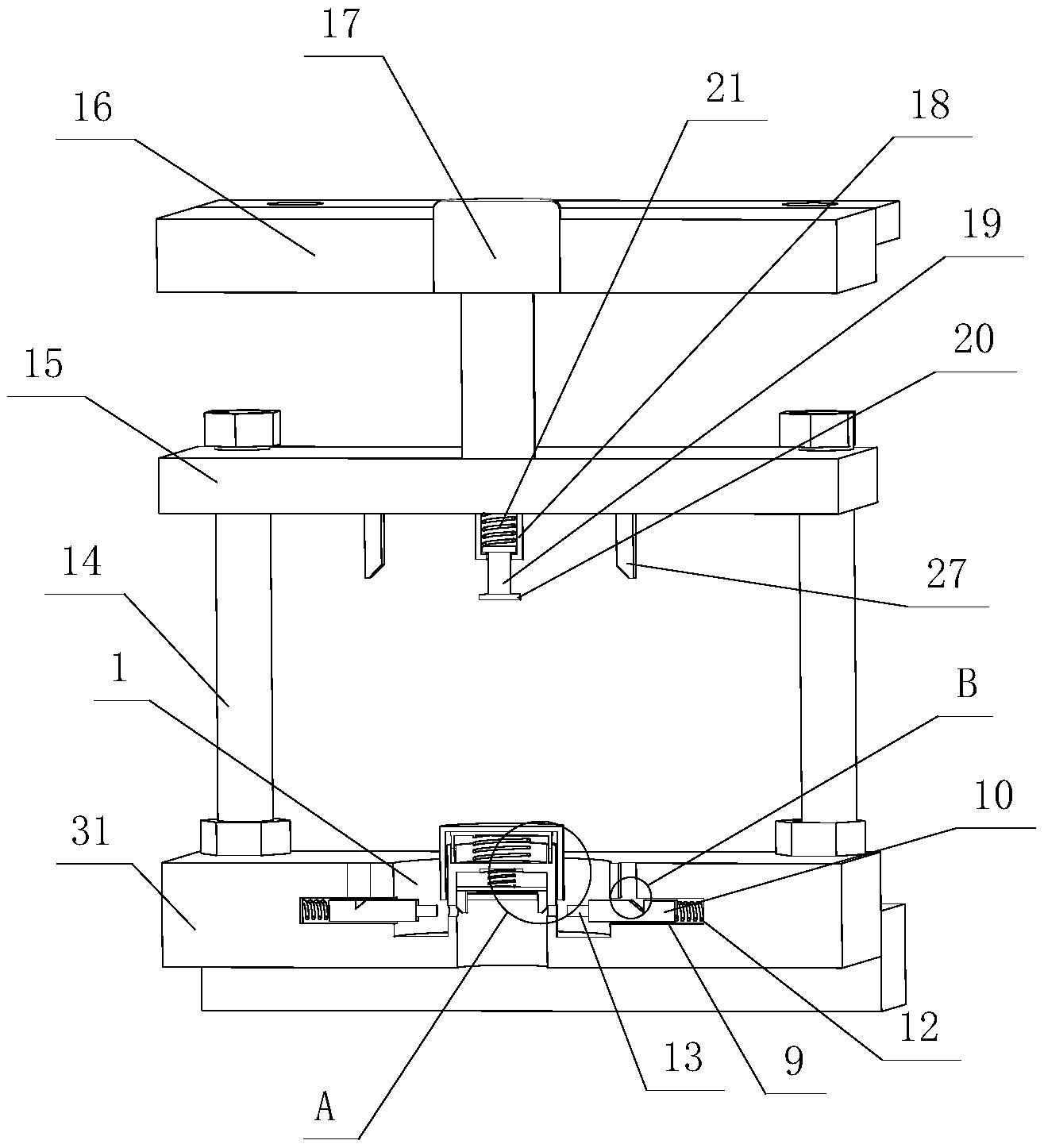 本实用新型涉及冲压模具技术领域,且公开了一种冲压模具,包括下模板,所述下模板的上表面开有槽口,槽口的内底壁固定连接有支撑柱,支撑柱的内部开设有滑动槽,滑动槽的内部滑动连接有滑动板,滑动板的底面固定连接有两个限位块,滑动板的上表面固定连接有第一弹簧,第一弹簧的另一端与滑动槽的内顶壁固定连接。该冲压模具,通过设置两个限位块能够使两个推柱在做完冲孔作业后,两个限位块能够将两个推柱上粘连的废料刮除,避免在下次冲孔时,两个推柱上的废料影响冲孔尺寸而导致下次冲孔时发生尺寸发生偏差,解决了因冲孔柱粘连废料而影响冲孔尺寸的问题,且当加工完成后支撑框能够自动将加工工件弹出,便于取出加工工件。