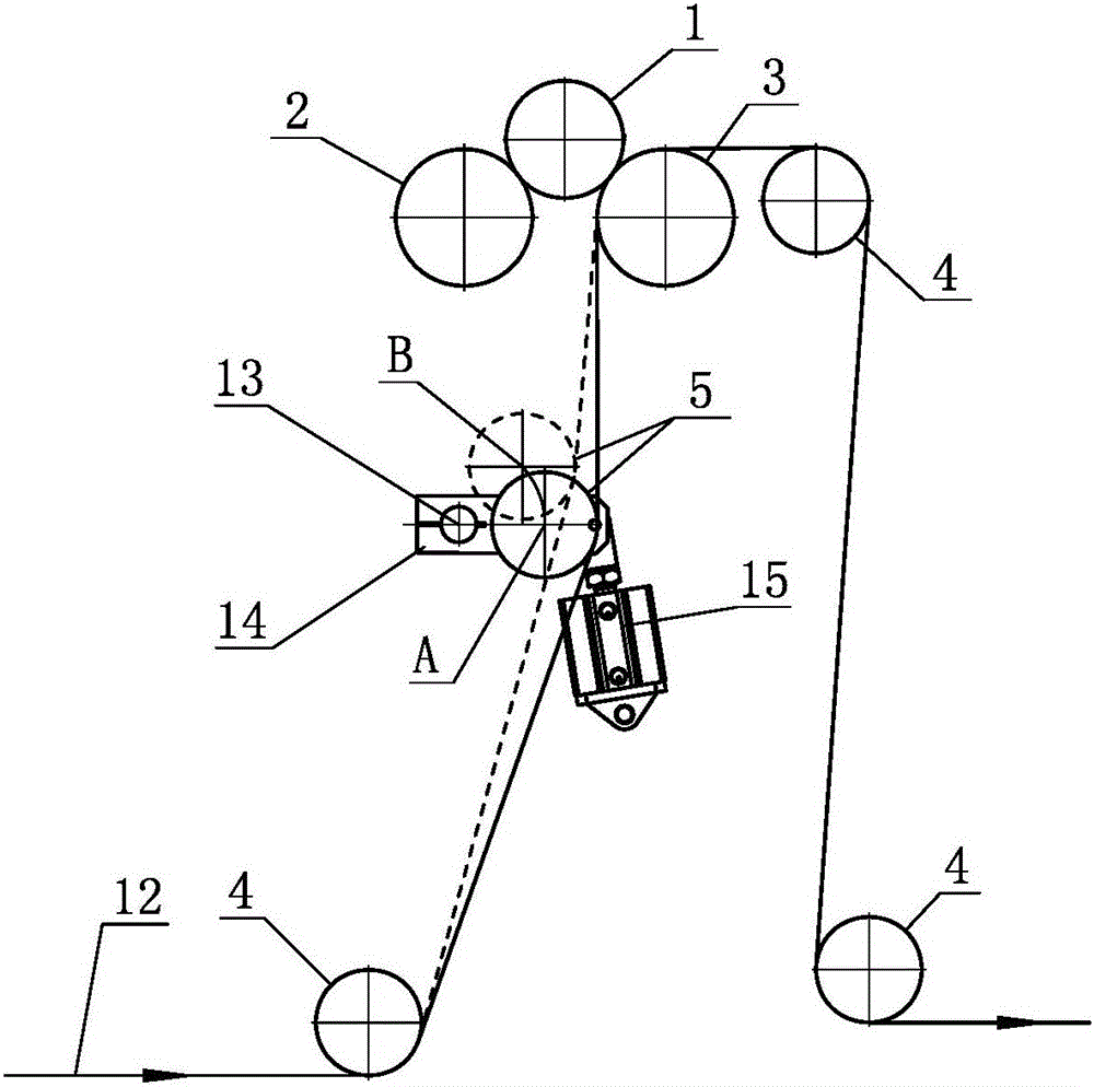本实用新型公开了一种印刷机预套准装置,包括印刷色组,印刷色组包括转动设置的底辊和版辊,印刷色组的上游转动设置有导辊,在印刷机两侧墙板上分别设置有与导辊连接的导辊位置调节机构。预套准时通过调节机构调节导辊的位置,使导辊向远离承印材料的方向移动,承印材料处于松开状态,不随底辊的转动而前行,承印材料的料路不发生变化,避免浪费承印材料,降低了生产成本,且结构简单,控制方便。