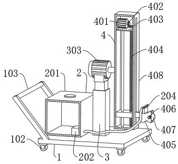 本实用新型公开了一种室内水电开槽机,包括用于移动和支撑固定的机架装置,所述机架装置上面设置有用于在开槽时防止灰尘扩散的喷洒装置,所述喷洒装置一侧设置有用于稳定升降并且提供旋转动力的升降装置,所述升降装置一侧设置有用于对墙面指定位置精确开槽的旋转装置;所述升降装置包括液压缸,所述液压缸顶端固定安装有连接座,所述连接座上面固定连接有第一电机,所述第一电机输出端设置有转轴。本实用新型所述的一种室内水电开槽机,通过螺纹啮合传动的设置,能够使开槽更加精确,提高了开槽的质量;通过对墙面喷水的设置,能够避免在开槽时产生大量灰尘,人们吸入灰尘对人体有害;通过电动升降开槽的设置,能够降低人工劳动强度。