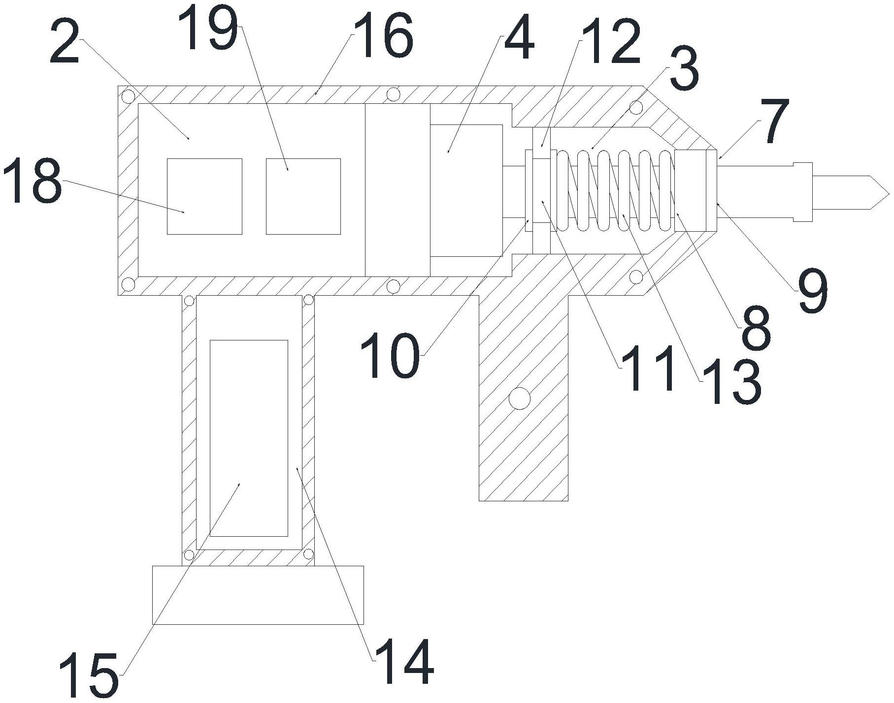 本实用新型涉及室内装修工具技术领域,一种室内装修用高效的墙面破碎设备,包括机体,机体包括外壳,外壳内设有驱动区,外壳的底部设有握杆,握杆内设有电池槽以及控制槽,驱动区内设有电机槽,电池槽内安装有供电模块,电机槽内安装有振动电机,外壳的端部设有输出口,振动电机的输出端安装有振动杆,本实用新型的钻头借助振动电机驱动振动杆的冲击力度实现反复锤击对墙面进行敲击,振动杆在反复运动的过程中利用弹簧进行缓冲实现弹簧阻尼的效果,避免振动杆运动过程中产生的反震力容易对振动电机造成损坏,从而保证本设备工作的稳定性,通过本设备的机械性能对墙面进行锤击,从而进一步提高本设备对墙面破碎工作的效率。