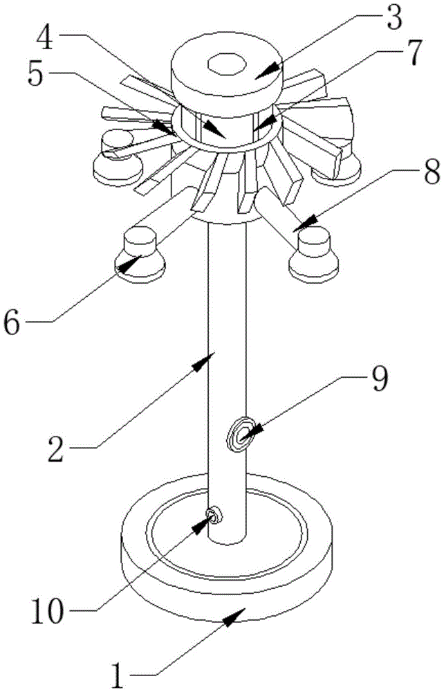 本实用新型公开了一种建筑施工工地用的喷淋除尘装置,包括底座、立柱、圆柱、叶轮和四个喷淋头,底座的固定连接有立柱,立柱的顶部固定连接有圆柱,圆柱外侧的中部开设有滑槽,滑槽的底部开设有四个均匀分布的条形槽,圆柱的内部开设有滑道,滑道的内部滑动连接有活动滑块,活动滑块的外侧固定连接有四个连接杆,四个连接杆的一端分别穿过四个条形槽与圆环的内圈固定连接,圆环的外侧与叶轮的内侧转动连接,滑道的底部开设有水室,本实用新型一种建筑施工工地用的喷淋除尘装置,随着建筑施工工地气流的加强,自动提高流量,从而增加喷淋水量,提高喷淋除尘效果,有效改善建筑施工工地的工地空气环境。