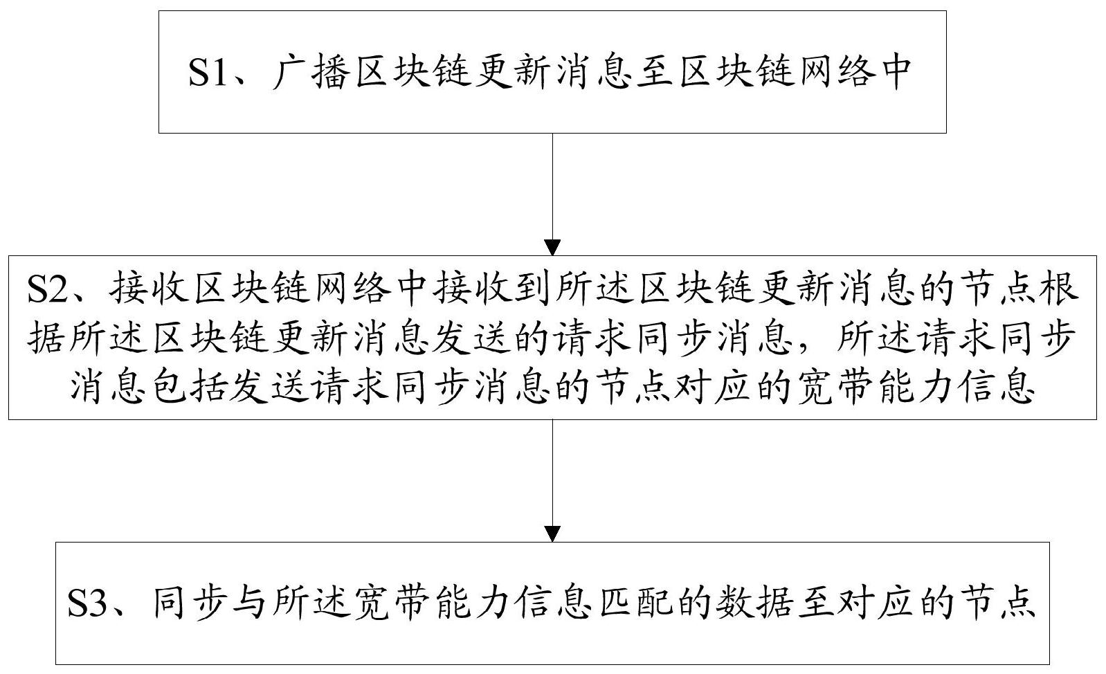 本发明提供一种区块链中节点间数据同步的方法及终端,广播区块链更新消息至区块链网络中;接收区块链网络中接收到所述区块链更新消息的节点根据所述区块链更新消息发送的请求同步消息,所述请求同步消息包括发送请求同步消息的节点对应的宽带能力信息;同步与所述宽带能力信息匹配的数据至对应的节点;实现基于区块链节点实时网络传输能力的数据同步机制,提高了区块链网络中的节点之间的数据同步效率,同时,由于区块链网络中各个节点的带宽能力的不可预测性以及不固定性,决定了进行数据同步的节点以及各个节点更新的数据的不可预测性,也保证了数据安全以及节点间的公平性。