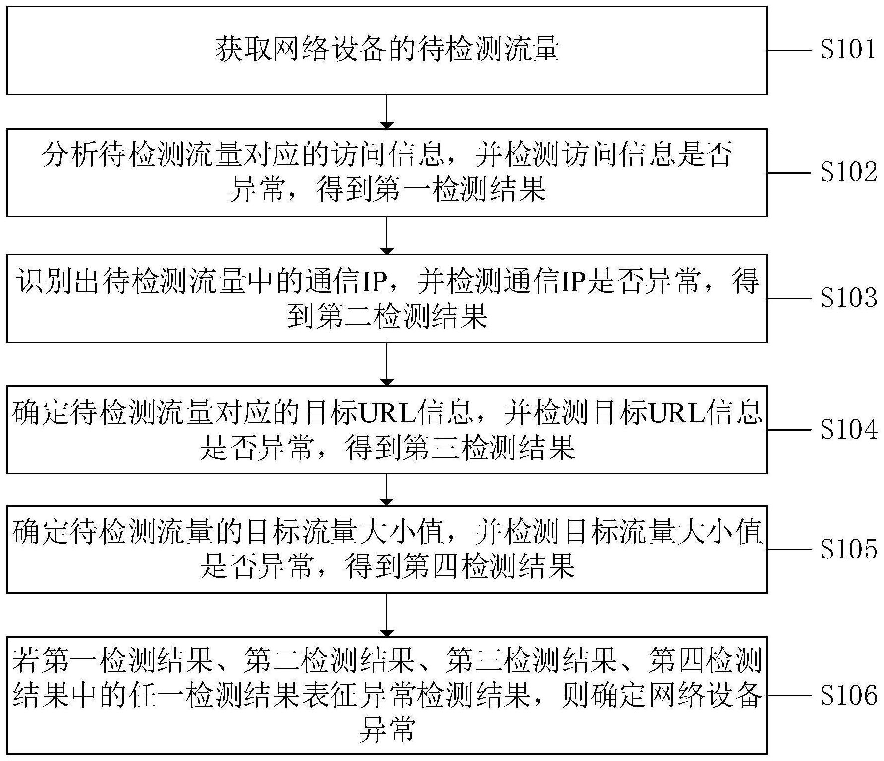 本申请公开了一种流量监控方法、系统、设备及计算机可读存储介质,获取网络设备的待检测流量;分析待检测流量对应的访问信息,并检测访问信息是否异常,得到第一检测结果;识别出待检测流量中的通信IP,并检测通信IP是否异常,得到第二检测结果;确定待检测流量对应的目标URL信息,并检测目标URL信息是否异常,得到第三检测结果;确定待检测流量的目标流量大小值,并检测目标流量大小值是否异常,得到第四检测结果;若第一检测结果、第二检测结果、第三检测结果、第四检测结果中的任一检测结果表征异常检测结果,则确定网络设备异常。提高了对网络设备进行异常检测的准确性。
