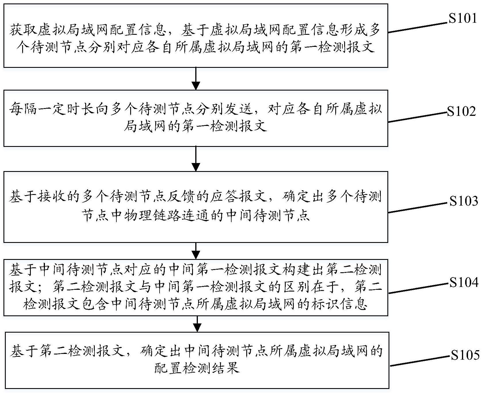 本发明提供了一种网络配置检测方法、装置及存储介质,方法包括:获取虚拟局域网配置信息,基于虚拟局域网配置信息形成多个待测节点分别对应各自所属虚拟局域网的第一检测报文;每隔一定时长向多个待测节点分别发送,对应各自所属虚拟局域网的第一检测报文;基于接收的多个待测节点反馈的应答报文,确定出多个待测节点中物理链路连通的中间待测节点;基于中间待测节点对应的中间第一检测报文构建出第二检测报文;第二检测报文与中间第一检测报文的区别在于,第二检测报文包含中间待测节点所属虚拟局域网的标识信息;基于第二检测报文,确定出中间待测节点所属虚拟局域网的配置检测结果。提高了对网络链路配置的检测及时性。