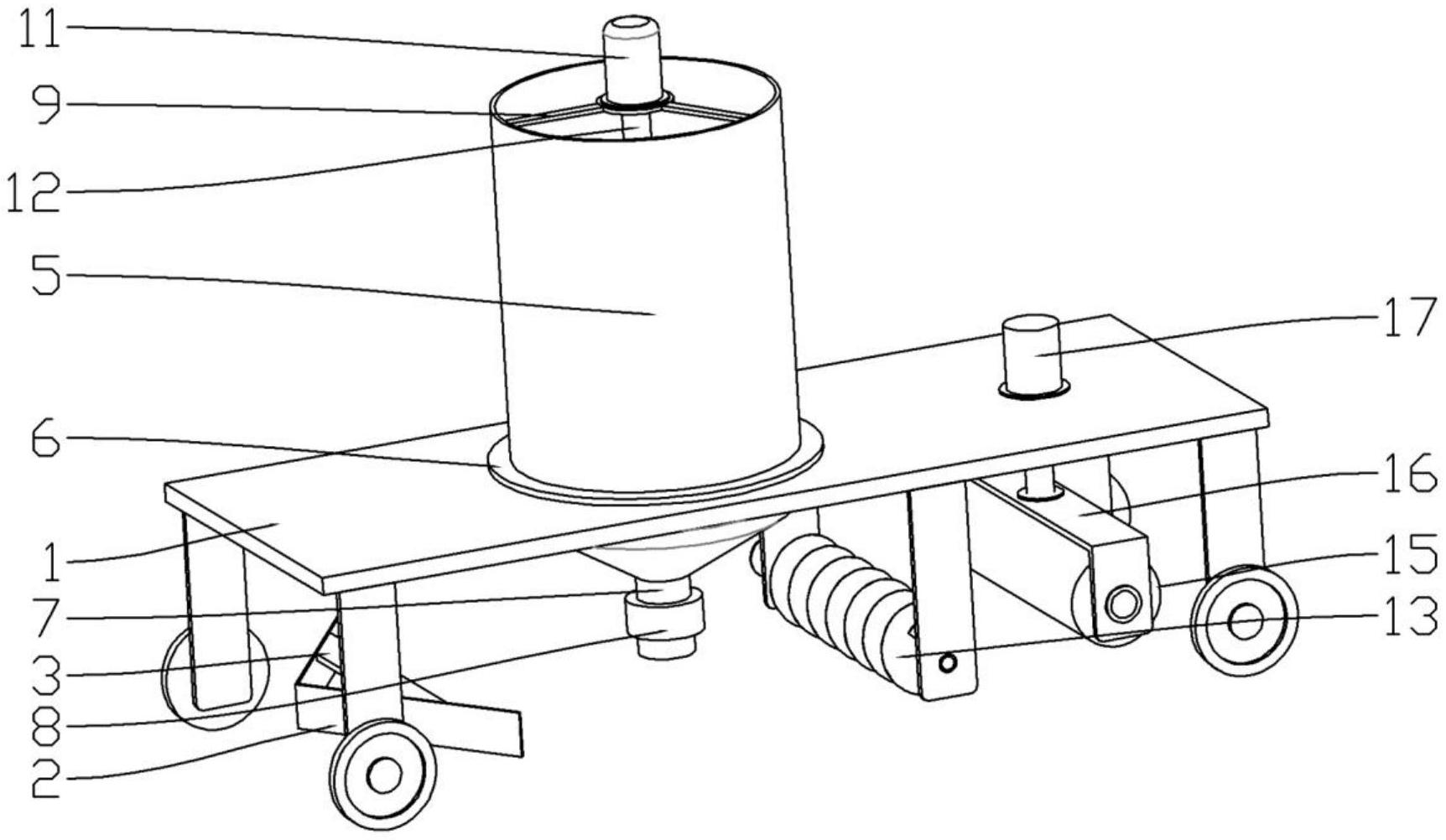 本实用新型涉及一种道路施工用路基处理装置。道路施工用路基处理装置包括移动小车以及从前至后依次设置在移动小车上的清障机构、出料机构、摊平机构以及压实机构;清障机构包括第一伸缩缸以及清障板;出料机构包括固定连接在移动小车上的料筒,料筒的下端设有出料管,料筒内设有搅拌器;出料管上设有卸料阀;摊平机构包括安装在移动小车底部的双向摊平绞龙以及驱动双向摊平绞龙转动的第一驱动电机,双向摊平绞龙沿左右方向延伸;压实机构包括压辊组件以及驱动压辊组件上下运动的第二伸缩缸,压辊组件沿左右方向布置。相比于现有技术,本实用新型的道路施工用路基处理装置能够将防水混凝土摊平、压实,提高了道路施工效率。
