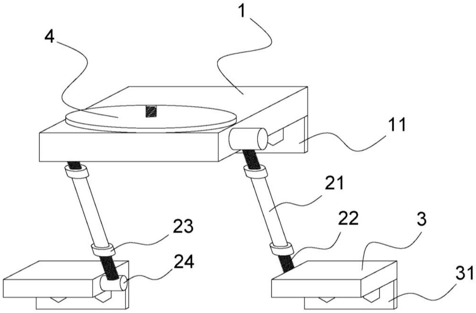 本实用新型公开了一种隧道施工快速调平装置,旨在解决现有的三脚架在隧道内的弧形管片上安装调平不便。一种隧道施工快速调平装置,包括放置台,调节组件包括套筒、调节丝杆和固定件,放置台通过第一连接板用于与隧道管片可拆卸连接,套筒的两端均固定连接有调节螺母,两个调节螺母均适配有与其螺纹连接的调节丝杆,套筒内设有令调节丝杆沿其中心轴线移动的调节空间,调节丝杆远离套筒的一端与固定件固定连接,固定件设置在放置台上,转动调节螺母带动调节螺杆上升或下降,从而使调节丝杆带动固定件令放置台上升或下降,通过调节丝杆的移动可快速对放在放置台上的进行调平。
