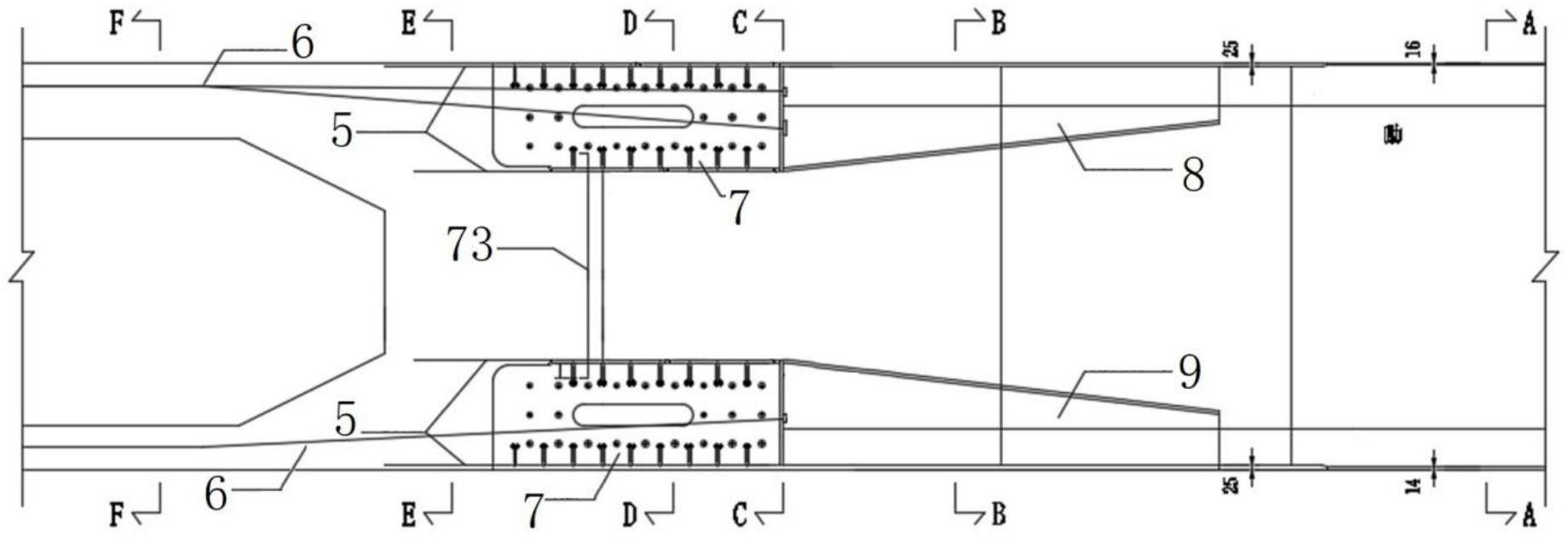 本实用新型公开了一种公路大跨度混合结合梁的钢混结合结构,通过设置尺寸相同且其立面依次连接的混凝土箱梁、钢混结合段、钢箱梁加强段和钢箱梁,通过在混凝土箱梁段与钢混结合段之间设置多根第一连接钢筋和多根预应力钢绞线,多根第一连接钢筋均呈水平布置加强混凝土箱梁和钢混结合段的连接,提高钢混结合段自身承载力,多根预应力钢绞线一端均与钢格室连接,另一端分别连接混凝土箱梁侧的顶板、底板、翼缘板、隔板和外隔板,保证受力均匀,设置顶板T型加劲肋和底板T型加劲肋的高度均自钢混结合段向钢箱梁加强段递减,以保证钢混结合段、钢箱梁加强段、钢箱梁段的刚度进行平顺过度。