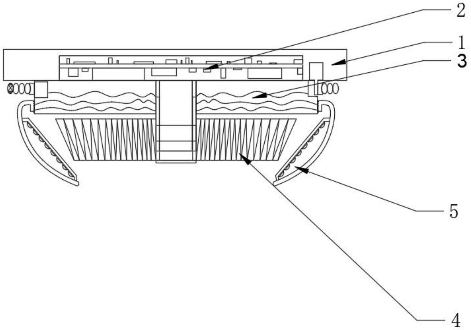本实用新型公开了一种空气净化灯,包括灯座,位于灯座内且由上至下依次设置的集成模块、加湿机构、鼓风机构、光盾灯组,光盾灯组透过光学膜的灯罩照射经加湿机构加湿过的空气,更大程度的提高净化质量,利用鼓风机构可以增加空气对流,所有机构基于集成模块控制,通过湿度监测控制空气湿度保持在人体最舒适、最利于健康的40%RH‑60%RH;本实用新型设置多个机构配合工作,采用离子雾化器和特制的发光二极管LED灯珠为实现舒适家居环境,而且无任何纳米粉尘产生,在人体无感的舒适使用下大幅度提高居住品质。