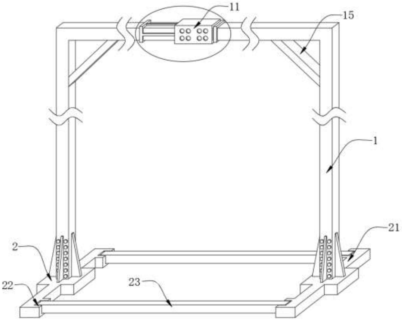 本实用新型属于钢结构框架技术领域,尤其为一种节能型装配式钢结构框架,包括两个框架本体起到主要支撑作用,所述框架本体为“L”形结构,其中一个所述框架本体的横杆上滑动连接有连接套筒用,所述框架本体底端可拆卸连接有固定底座用以对所述框架本体进行支撑和固定,两个所述固定底座之间卡合有两个固定杆;框架本体为“L”形结构,能够降低装配式框架的横杆与竖杆之间的连接点的数量,同时不需要使用吊装机构对横杆进行吊装支撑,且不需要额外的工作人员对横杆进行托扶,能够有效降低人力和机械的使用,连接套筒能够便于两个框架本体的安装,固定底座能够增强整体框架的稳定性,固定杆能够便于框架本体的横杆对齐。
