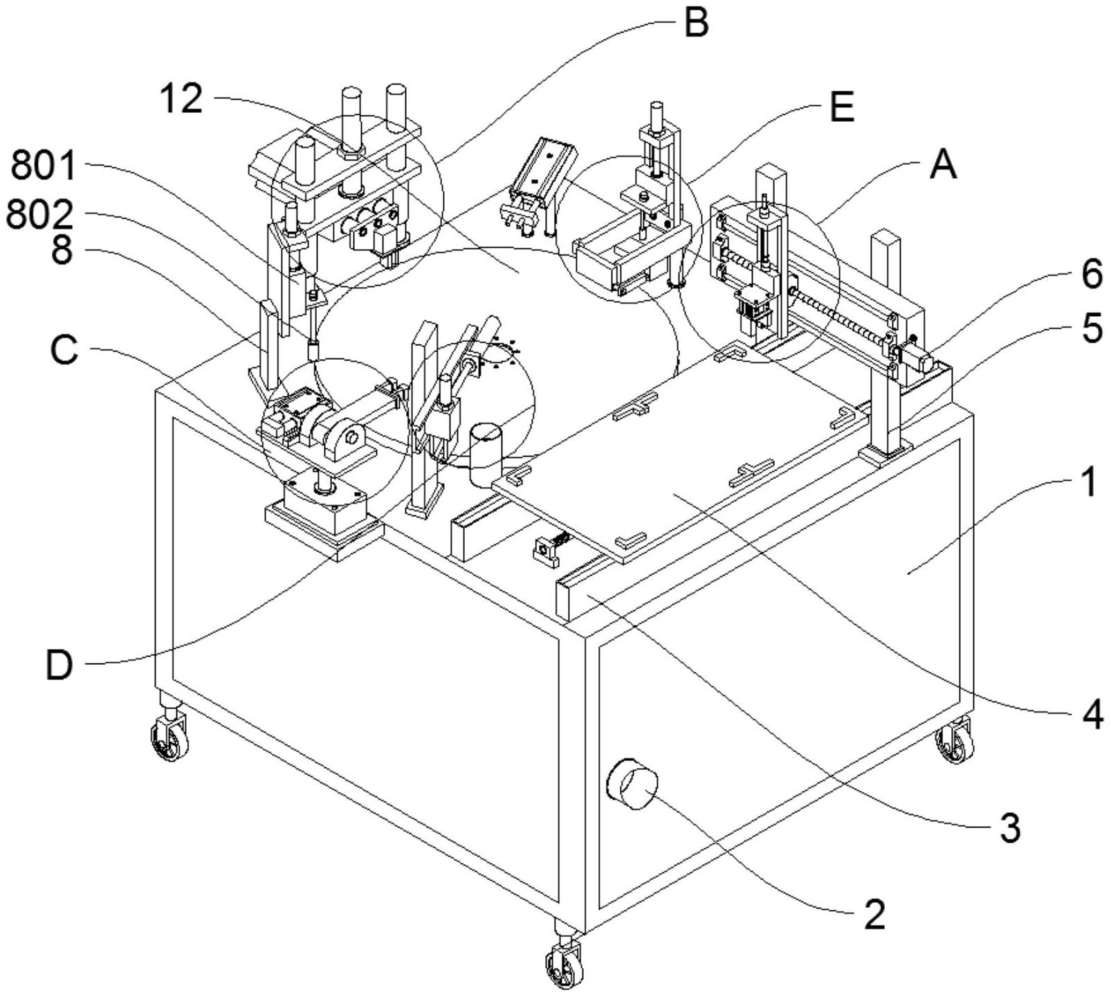 本实用新型公开了一种火花塞的陶瓷件和金属件套合装置,包括操作台,操作台上端面一侧固定安装有一对固定架,固定架的表面一侧固定安装有第一物料抓取机构,第一物料抓取机构的一侧固定安装有垫圈抓取机构,垫圈抓取机构的另一侧安装有第二物料抓取机构,第二物料抓取机构在远离垫圈抓取机构的一侧安装有装配机构,装配机构在远离第二物料抓取机构的一侧安装有翻转机构,且翻转机构在远离装配机构的一侧安装有废品抓取机构,操作台上端面位于各机构中心处转动安装有物料盘,且物料盘的表面等距安装有若干装配座。