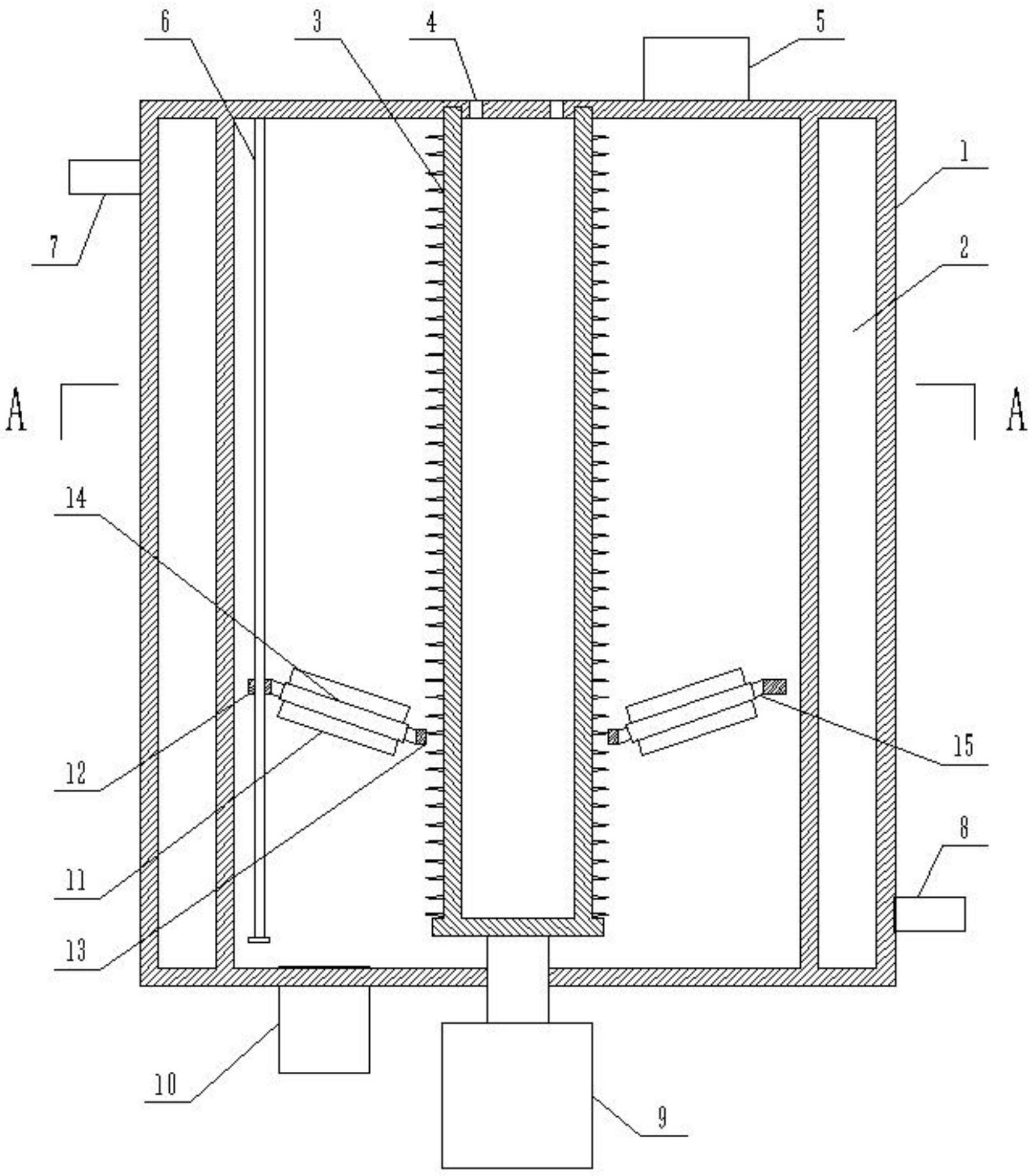 本实用新型涉及茶油加工设备技术领域的一种油茶籽油生产过程碱炼装置,包括装置本体,装置本体的侧壁设有夹层,装置本体的内部设有可转动的加热筒,加热筒与夹层之间形成碱炼腔,碱炼腔内设有搅拌组件;加热筒的外壁上设有外螺纹,加热筒的底部通过转动轴与正反转电机连接;搅拌组件包括内连接环及外连接环,内连接环与加热筒螺纹配合,内连接环与外连接环之间通过多个连接杆固定连接,连接杆上套设可转动的搅拌叶,外连接环上穿设有竖直的导向杆。本实用新型结构简单合理,使用方便,提高了搅拌效果,同时使液体各部位的温度更加均衡,进一步提高了碱炼效果;能源利用率高;碱炼效率高,碱炼质量好,有利于现代化的生产。