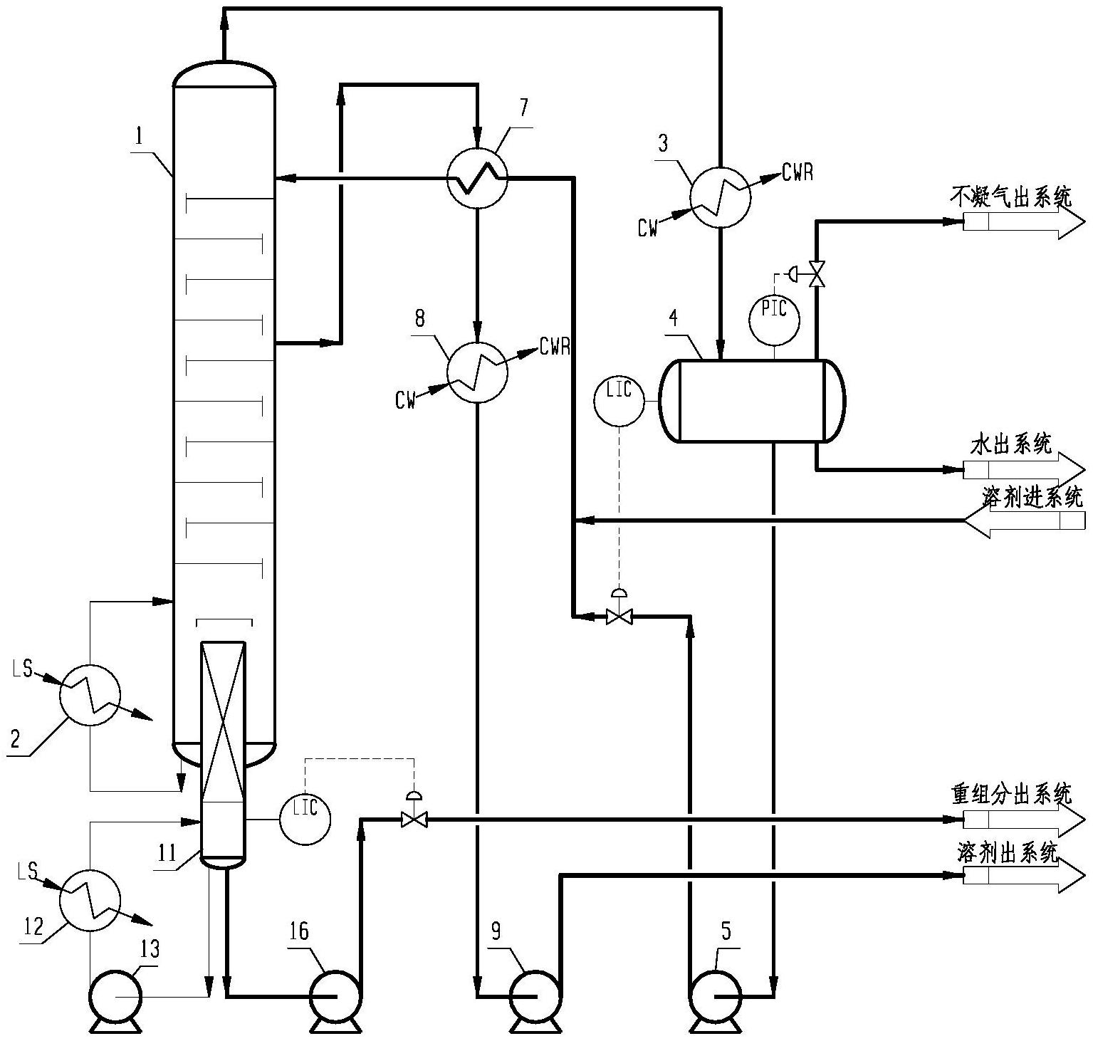 本实用新型公开了一种合成橡胶生产过程中溶剂回收精制装置,由精馏大塔与精馏小塔组成一个精馏系统,精馏大塔配置大塔再沸器和冷凝器,精馏小塔配置小塔再沸器,精馏大塔底部釜液转移进入精馏小塔上部,然后在该小塔内被再精馏,精馏小塔釜液为被浓缩的重组份杂质,精馏小塔塔顶馏出气体直接进入精馏大塔底部气相空间,参与精馏大塔再分离;相对于现有工艺,本发明以尽可能少的设备和尽可能低的能量消耗,降低了外排重组份中溶剂的含量与外排量,降低产品溶剂消耗,具有工艺流程简单,设施占地省,投资小,能耗低,溶剂回收率高等优点。