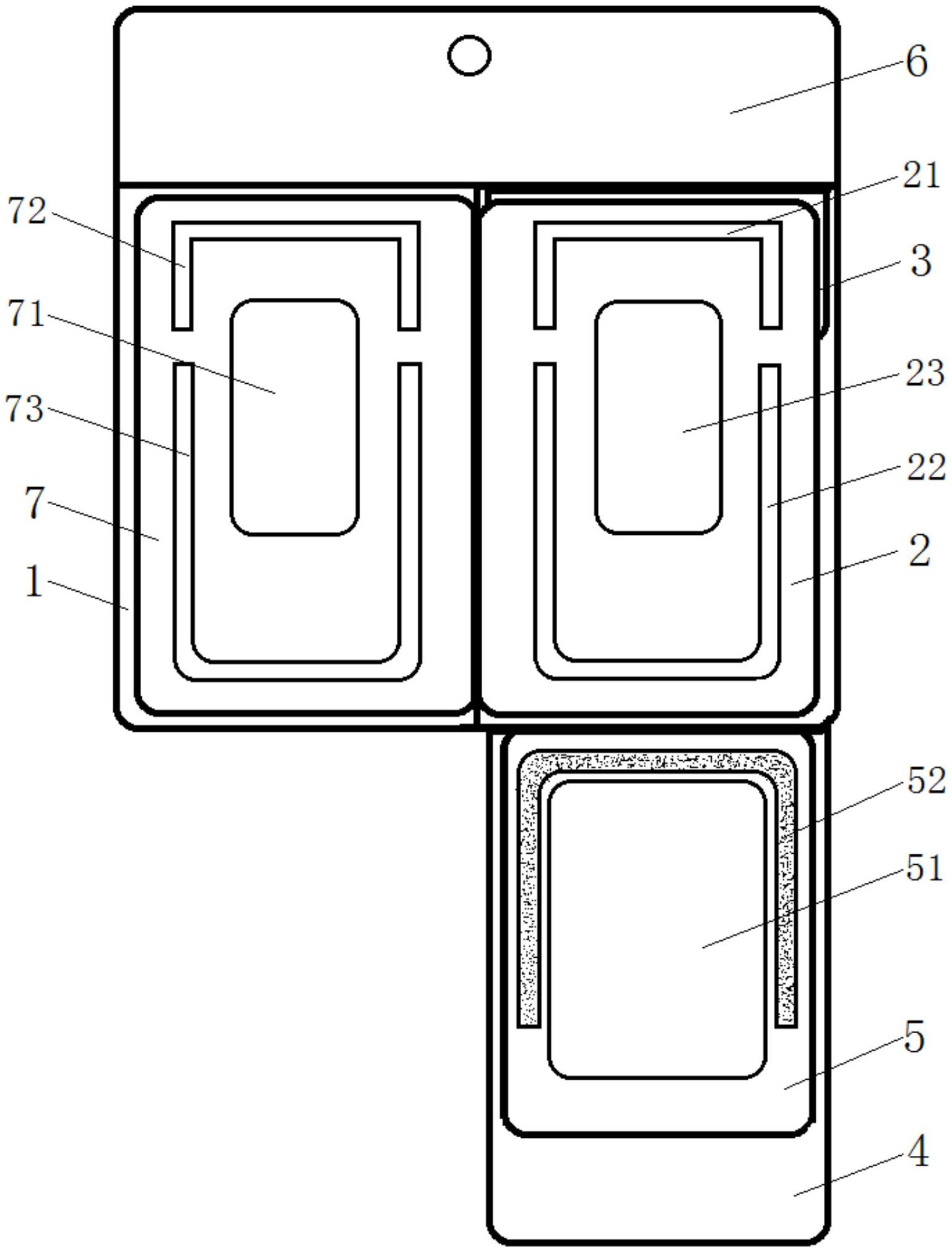 本实用新型公开了一种口袋内外圈组合缝制模板,所述的缝制模板包括底板、第一压板、第二压板和第三压板;所述第一压板可翻转地连接在所述底板的中部,所述底板的一侧与所述第一压板对应设置有第一针槽和第三针槽,所述底板的另一侧与所述第一压板还对应设置有第二针槽和第四针槽;所述的第二压板和所述第三压板可翻转地连接在所述底板上且分别位于所述第二针槽的两端;所述第三压板上设置有与所述第二针槽相匹配的第五针槽。本实用新型设计的缝制模板的结构设计简单、使用便捷、制造成本低;并且使用该缝制模板后能够极大地提升加工效率,将传统人工缝制的时间由原来的接近200秒,缩短至110秒左右,大幅的缩短了加工时间,提升了生产效率。