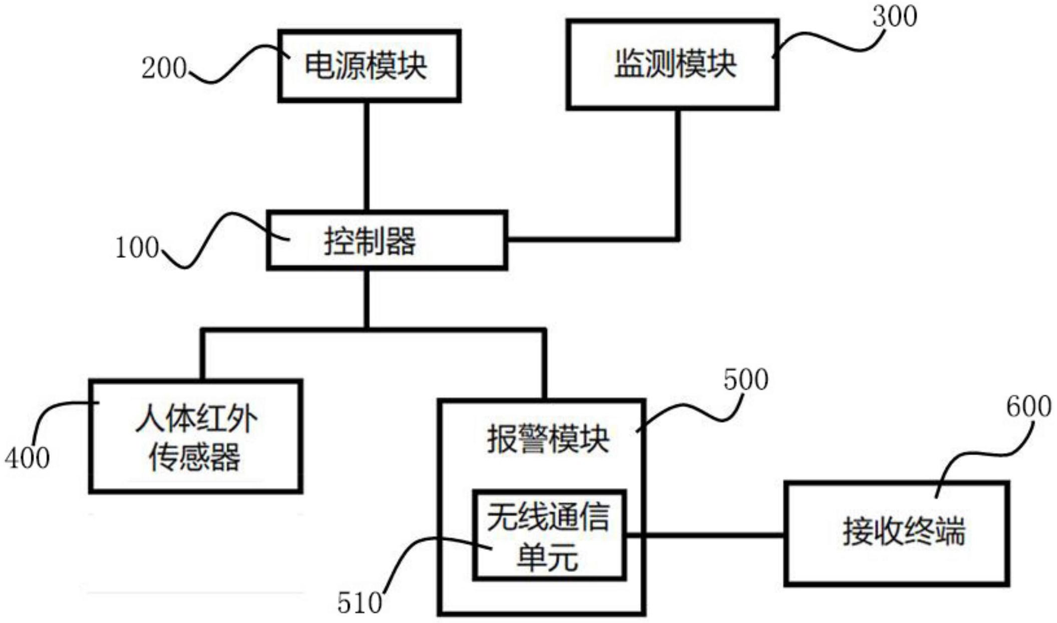 本实用新型涉及汽车安全技术领域,具体公开了一种可靠性好且有效响应的锁车状态下车内遗留人员报警系统,包括控制器,为控制器供电的电源模块,用于检测车门锁关闭状态的监测模块、用于识别车内遗留人员情况的人体红外传感器、用于接收报警开启信号的报警模块以及接收终端;电源模块由车载电源取电并与汽车点火系统电性连接,用于在点火系统处于点火状态时充电,在点火系统处于熄火状态时停止充电并向控制器发送第一控制信号;控制器接收第一控制信号及车门锁处于关闭状态信号时,控制人体红外传感器检测车内人员遗留情况,并在接收人体红外传感器反馈信号及判断车内存在遗留人员时,控制报警模块向接收终端发送信号。
