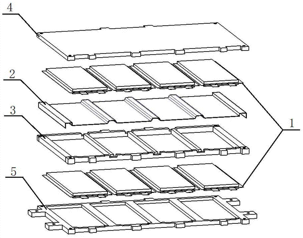 一种软包锂离子电池模块,所述模块包括软包锂离子电池层单元、底板、上盖、紧固螺栓;所述软包锂离子电池层单元包括软包锂离子电池、框架、散热板,所述框架为矩形结构,由至少一个矩形腔体构成,所述散热板设有形状及数量与所述框架的矩形腔体数量相同的凹坑,所述散热板卡装在所述框架中,散热板上的凹坑陷入框架的矩形腔体中;所述软包锂离子电池设置在所述散热板的凹坑中,整体构成软包锂离子电池层单元;至少两个软包锂离子电池层单元沿厚度方向叠置通过紧固螺栓固定安装在底板与上盖之间,构成软包锂离子电池模块。电池的一个表面与散热板实现贴合,便于散热,框架上布置的散热风道增强了散热功能。软包锂离子电池层单元可以横向进行扩展,也可以多层叠压实现厚度方向的扩展,便于布置,具有结构紧凑,能量密度高的特点。